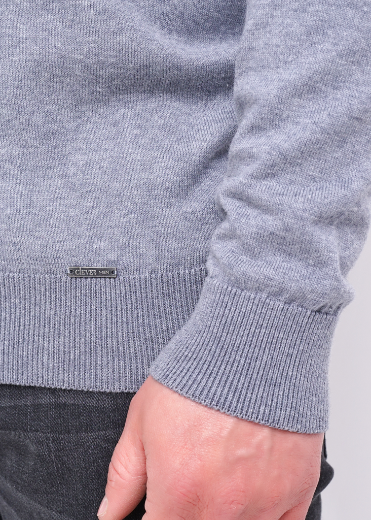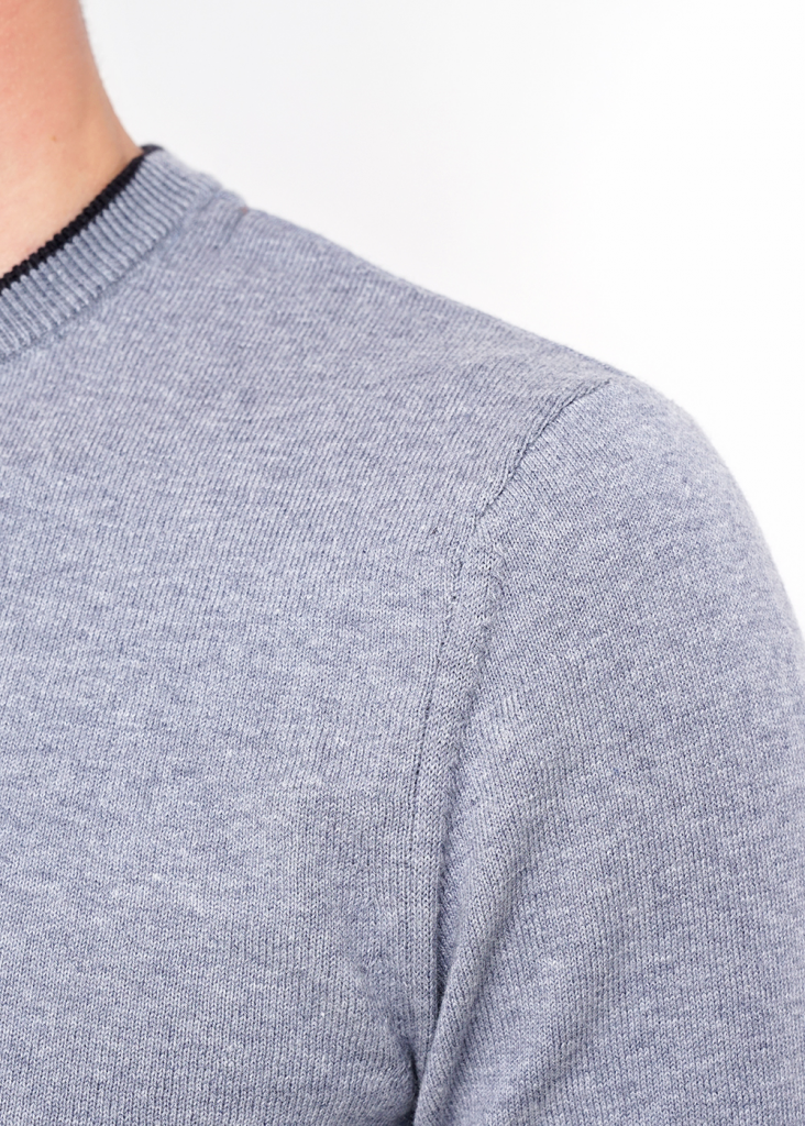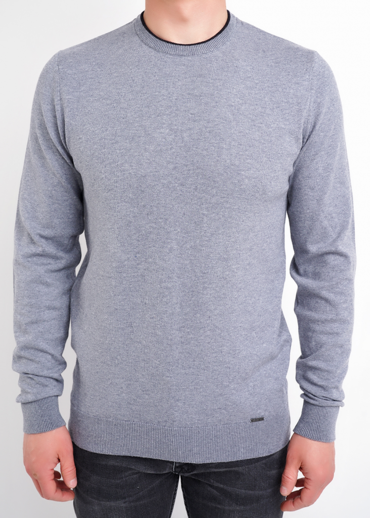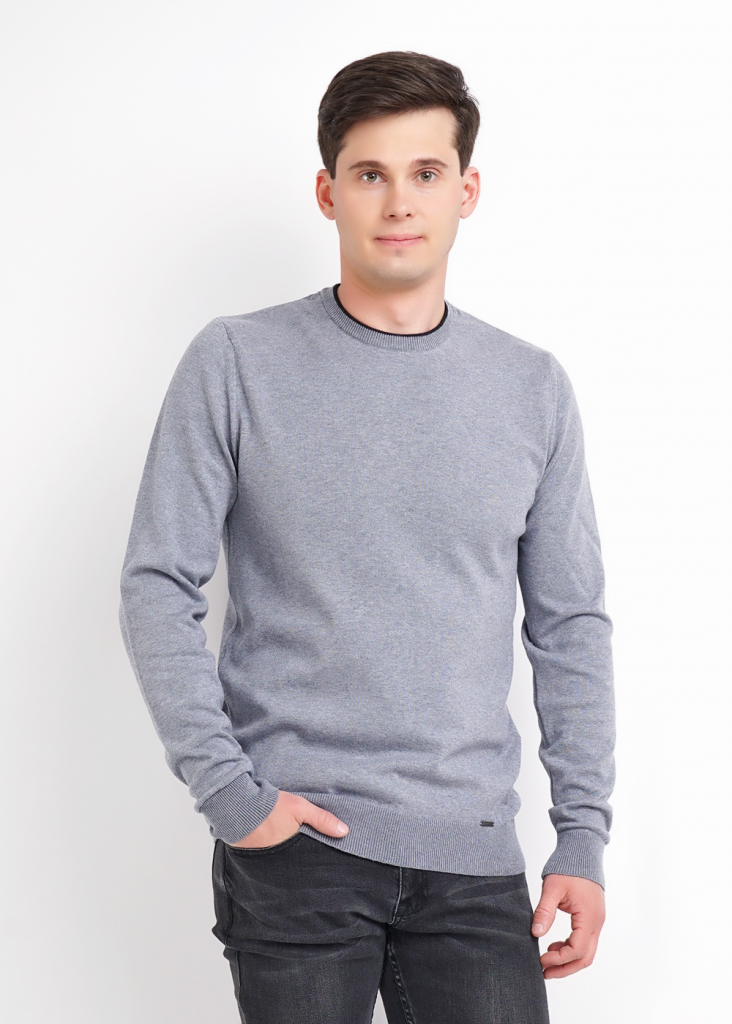 Мужской вязаный джемпер с круглым вырезом горловины в базовом ассортименте. Модель завершенная благодаря двойной контрастной горловине, декоративной полосатой тесьме и провязаной обтачке по спинке. Модель дополняет металлофурнитура по низу.