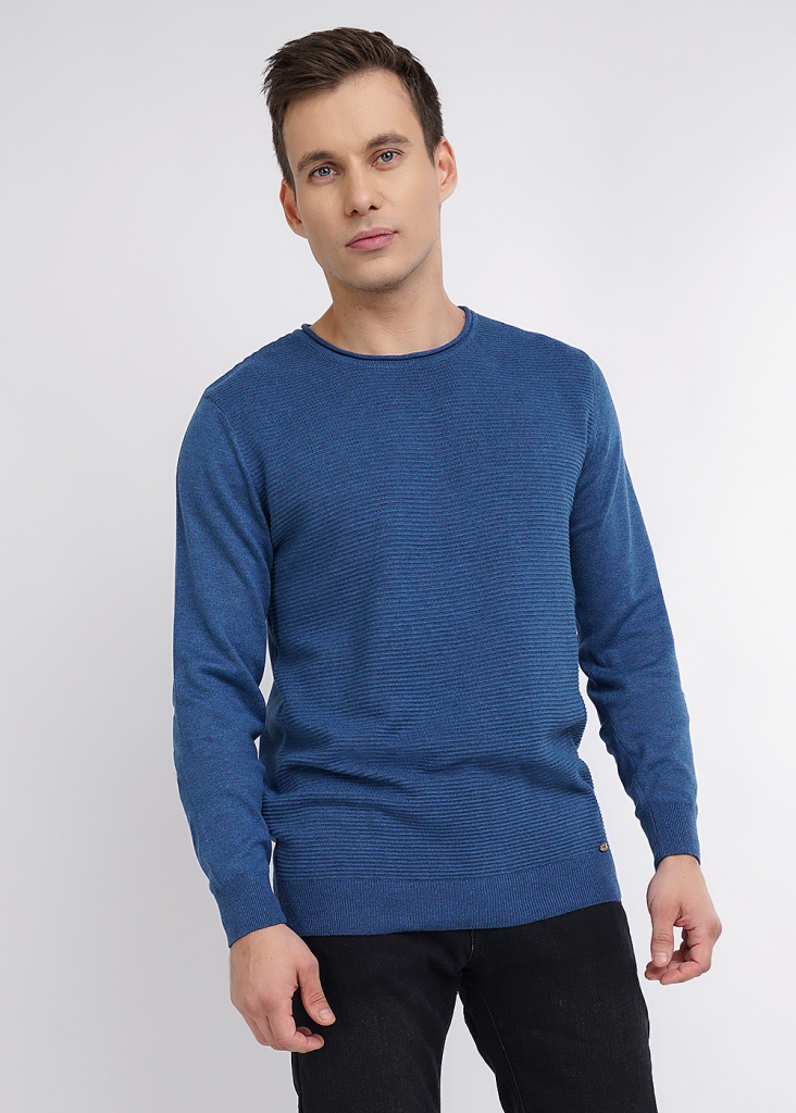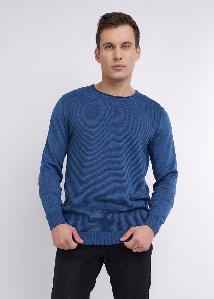 Мужской вязаный джемпер с круглым вырезом горловины и длинным втачным рукавом. Модель из смесовой пряжи с фактурной вязкой, благодаря эластичным манжетам и поясу сохраняет тепло. Модель универсальна, поэтому подойдет с любым низом.