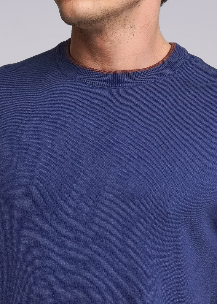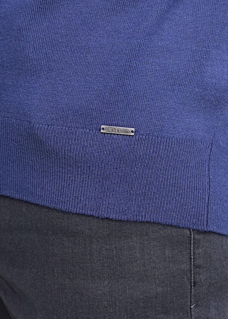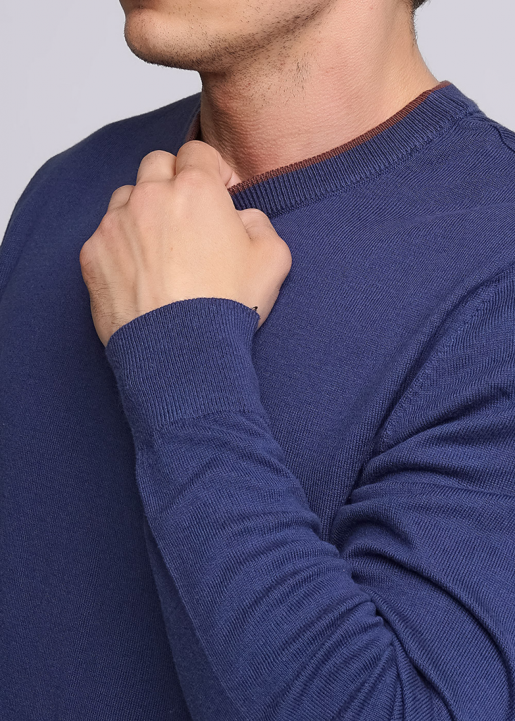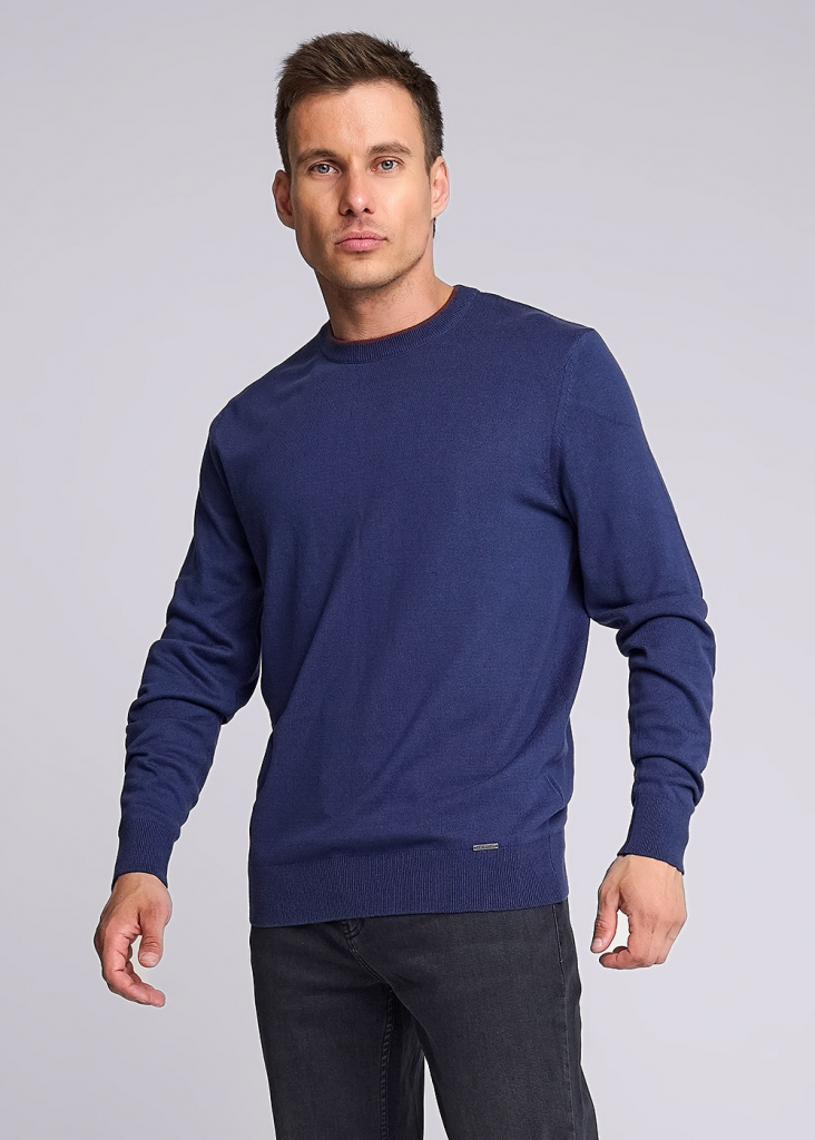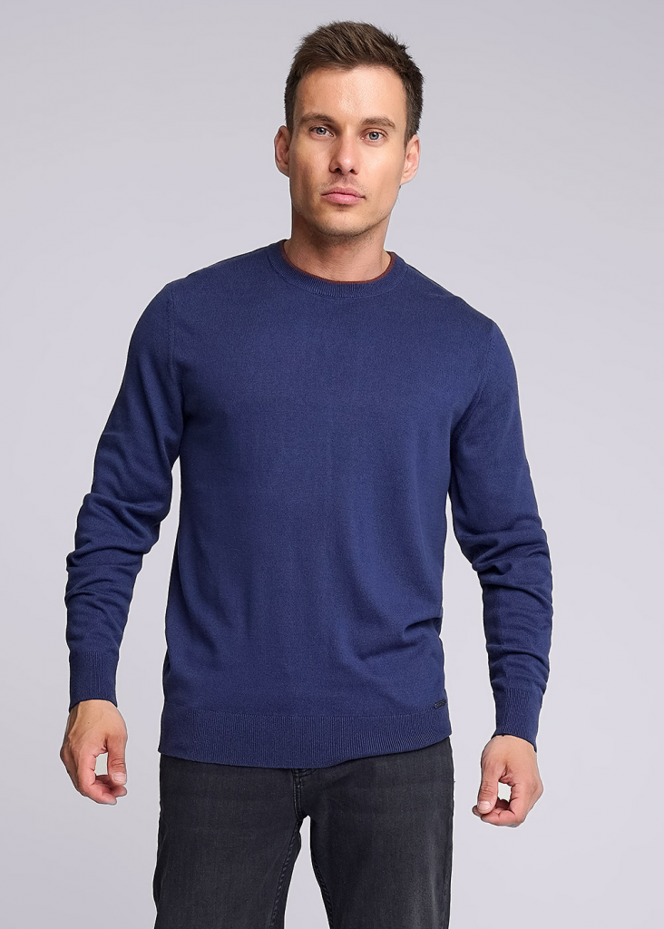 Мужской базовый вязаный джемпер с круглым вырезом горловины и длинным рукавом. Джемпер из смесовой пряжи с хлопком, дополнена интересными акцентами фирменной фурнитуры. Модель относится к базовому ассортименту, которая подойдет к любому низу.