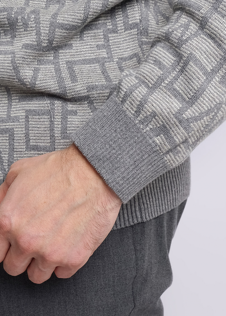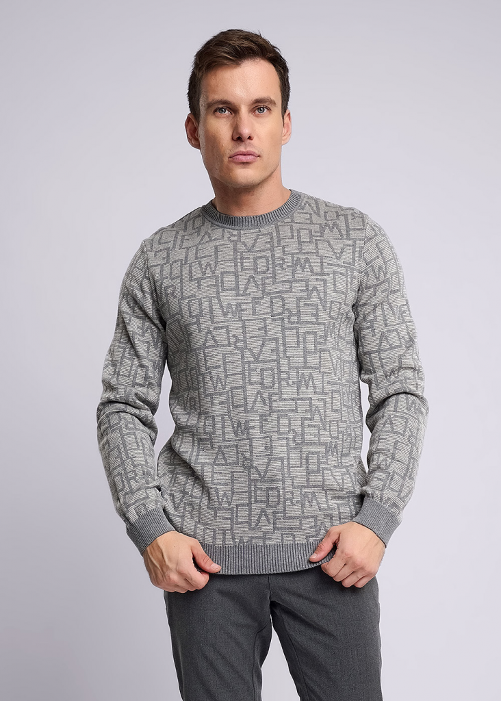 Джемпер мужской вязаный с круглым вырезом горловины и длинным втачным рукавом. Изделие из смесовой пряжи с шрифтовым жаккардовым переплетением, дополнена фирменной фурнитурой. Модель универсальна, поэтому подойдет к любому низу.