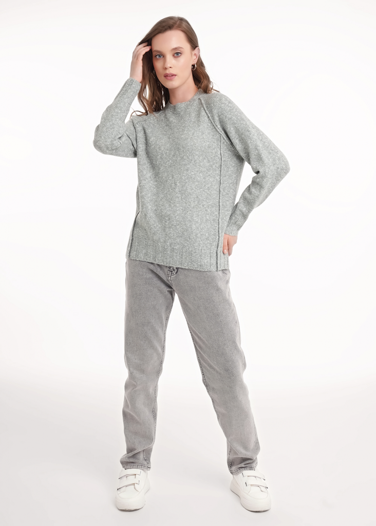 Вязаный джемпер прямого силуэта из акриловой пряжи с добавлением хлопка.Основное переплетение гладь. Длинный рукав реглан. Припуски наружу ,красивые сбавки по рукаву реглан. По низу рукава и изделия манжеты. Округлая горловина с бейкой.