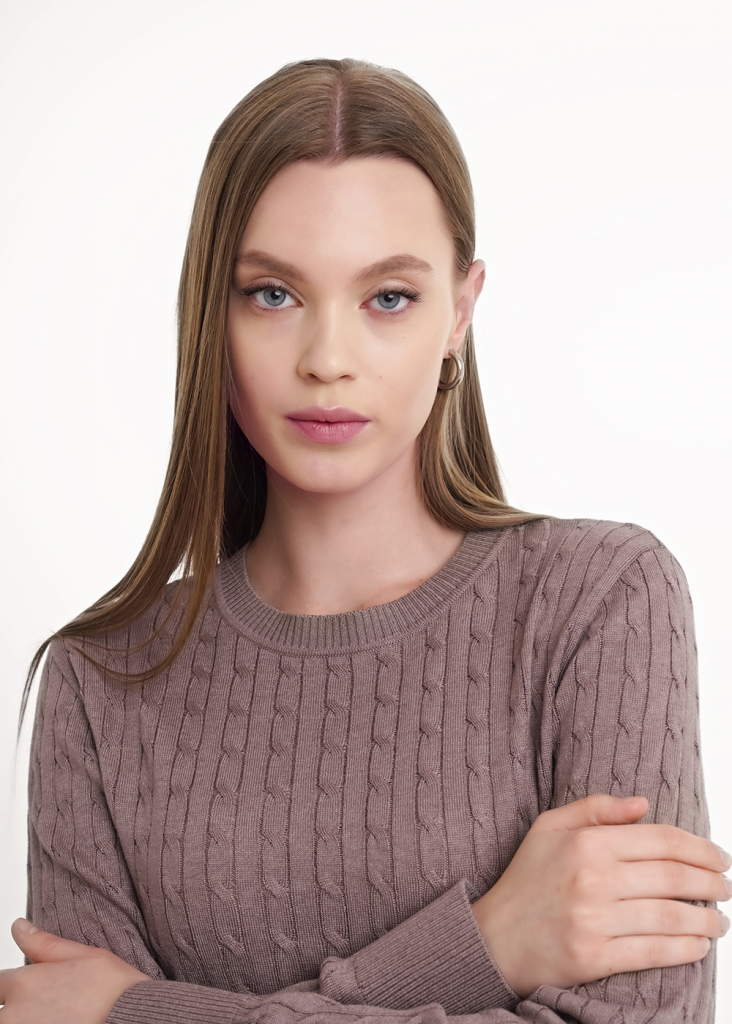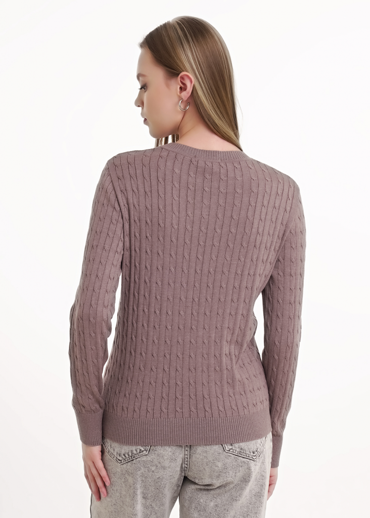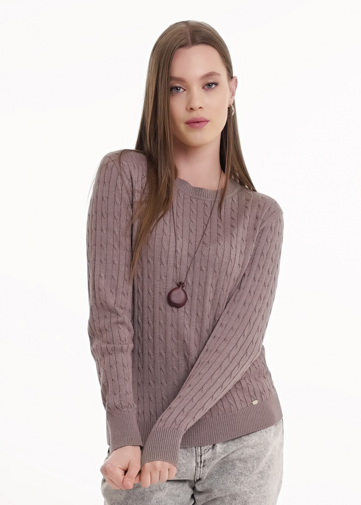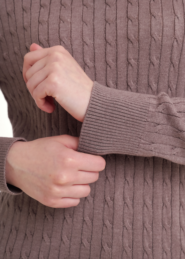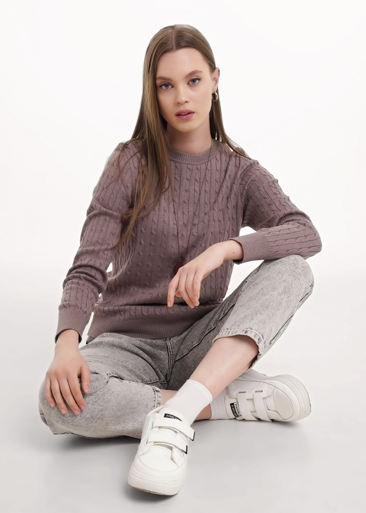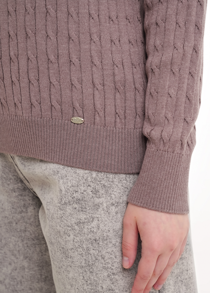 Вязаный джемпер прямого силуэта из хлопковой пряжи с добавлением акрила, переплетение "косы". Втачной длинный рукав. Округлая горловина с бейкой. По низу изделия и рукавов манжеты.