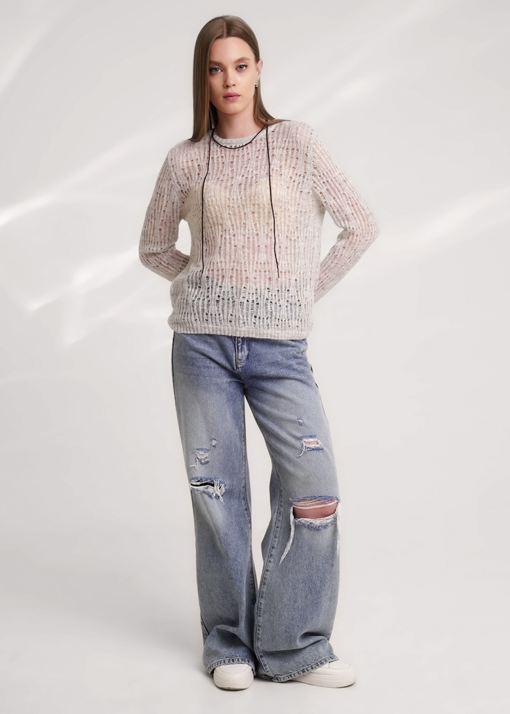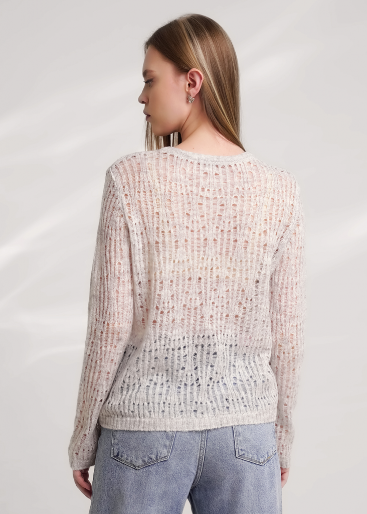 Вязаный джемпер из акриловой пряжи, переплетения ажур на основе глади. Длинный втачной рукав. Округлая горловина с бейкой. По низу изделия, рукавов манжеты.