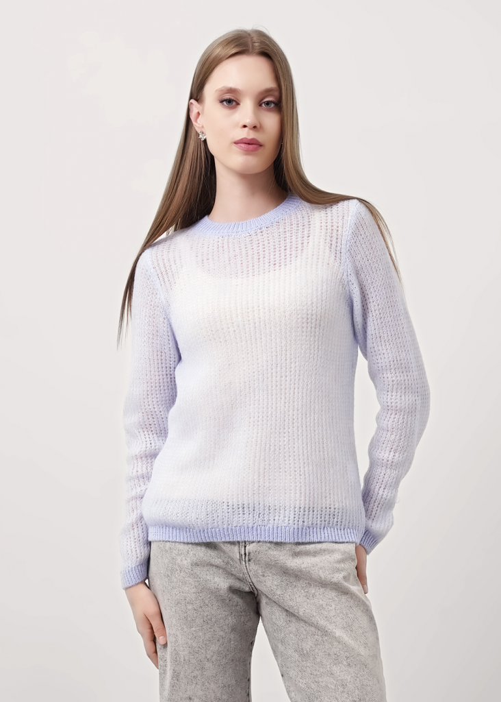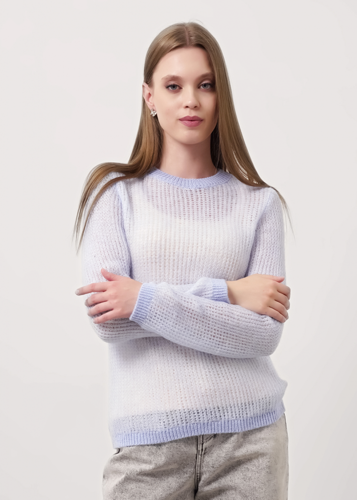 Вязаный джемпер из акриловой пряжи, переплетения "полуфанг". Длинный втачной рукав. Округлая горловина с бейкой. По горловине и манжетам ластик.