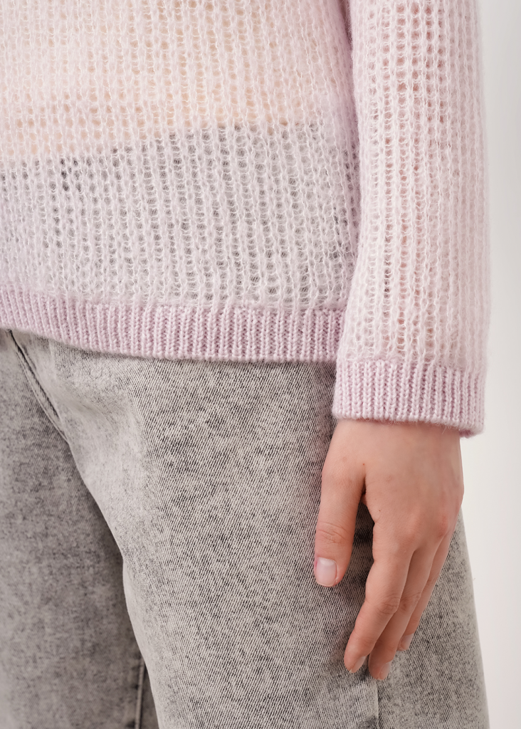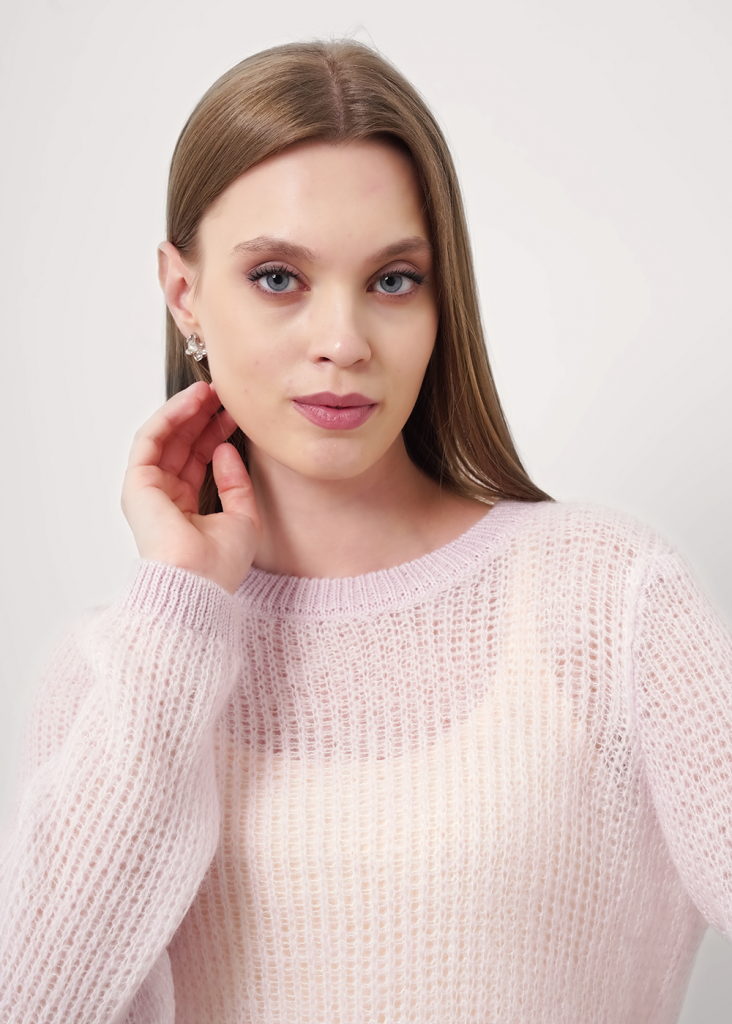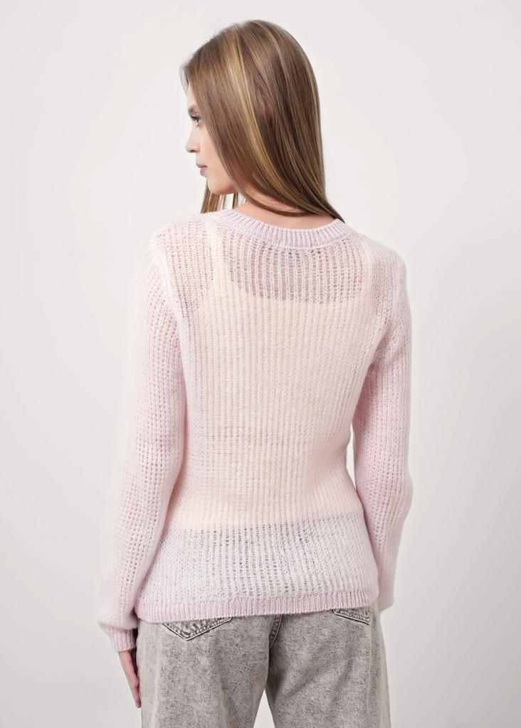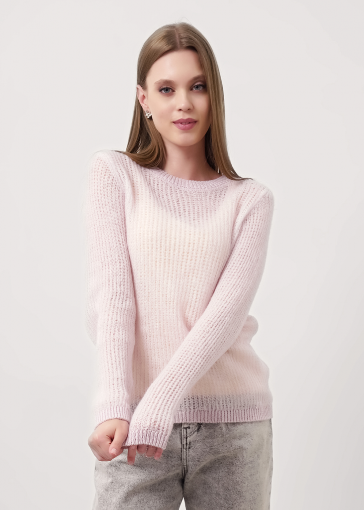 Вязаный джемпер из акриловой пряжи, переплетения "полуфанг". Длинный втачной рукав. Округлая горловина с бейкой. По горловине и манжетам ластик.