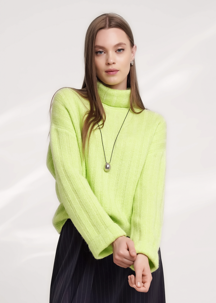 Вязаный джемпер из акриловой пряжи, переплетения широкий ластик 4*3, свободного силуэта. Длинный рукав со спущенной линией плеча, по низу рукава отворот. По горловине стойка с отворотом. По низу изделия манжет.