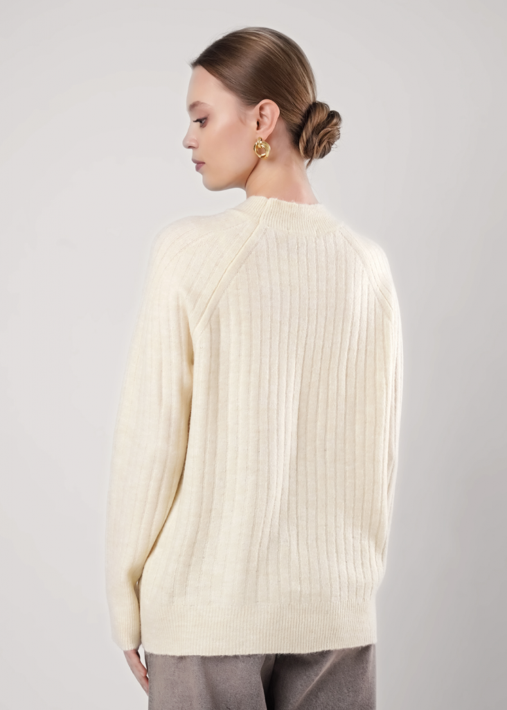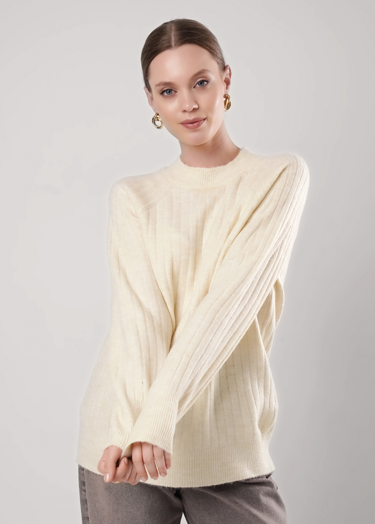 Вязаный джемпер из акриловой пряжи, ластичного переплетения. Длинный рукав реглан. По низу рукава и изделия манжеты. Округлая горловина с бейкой.