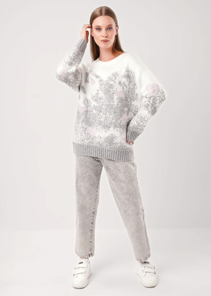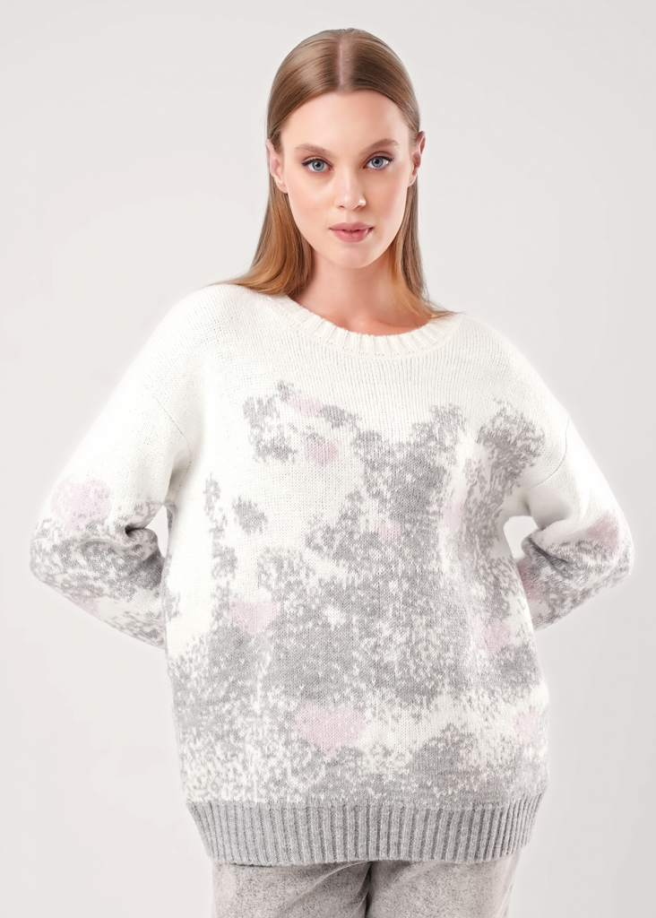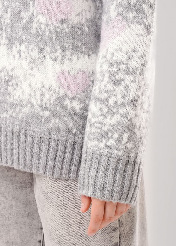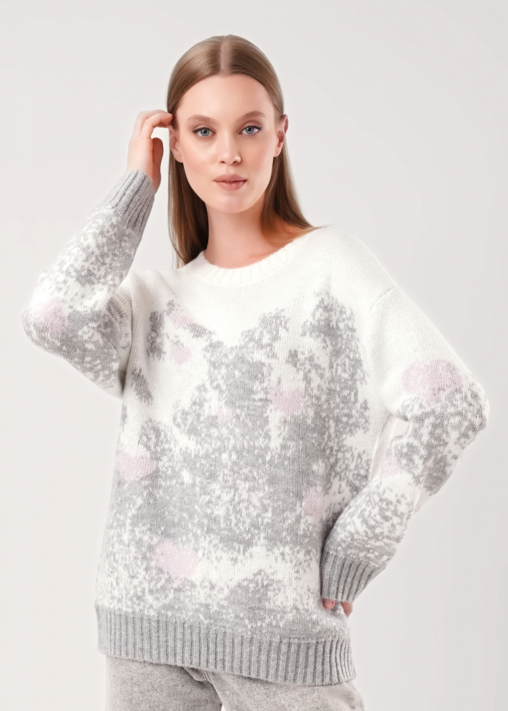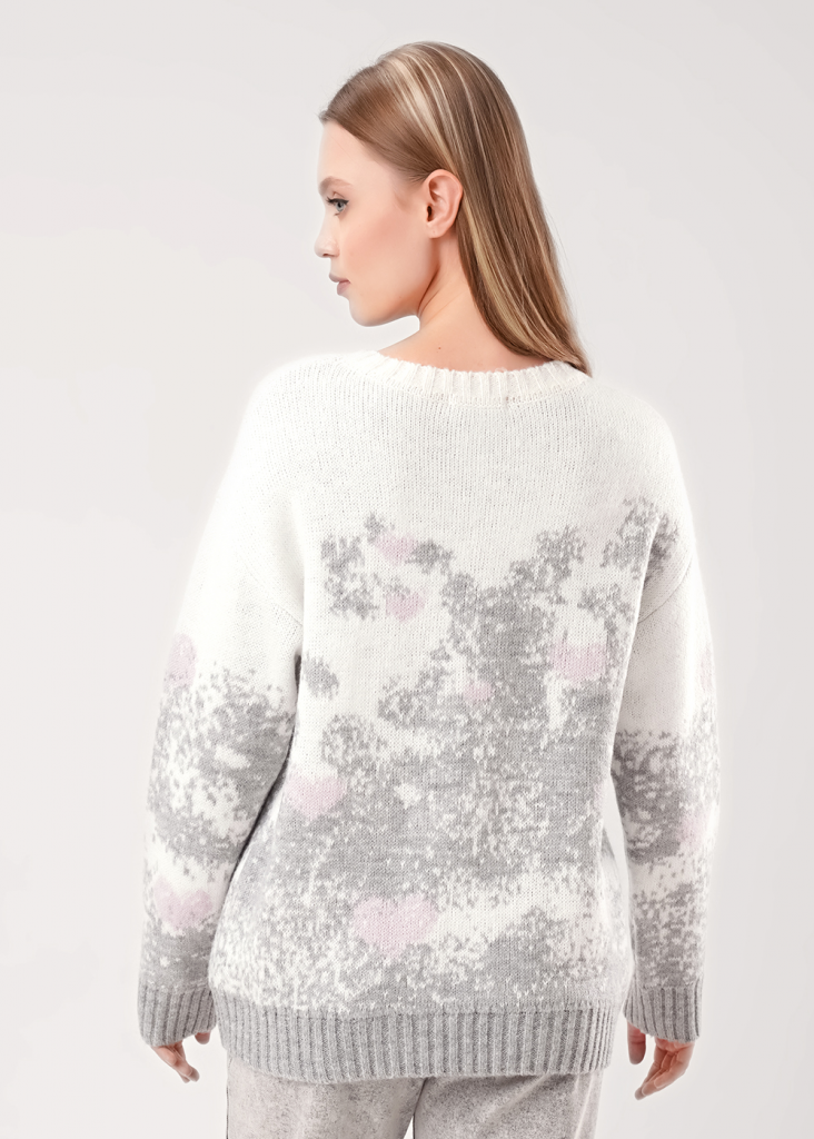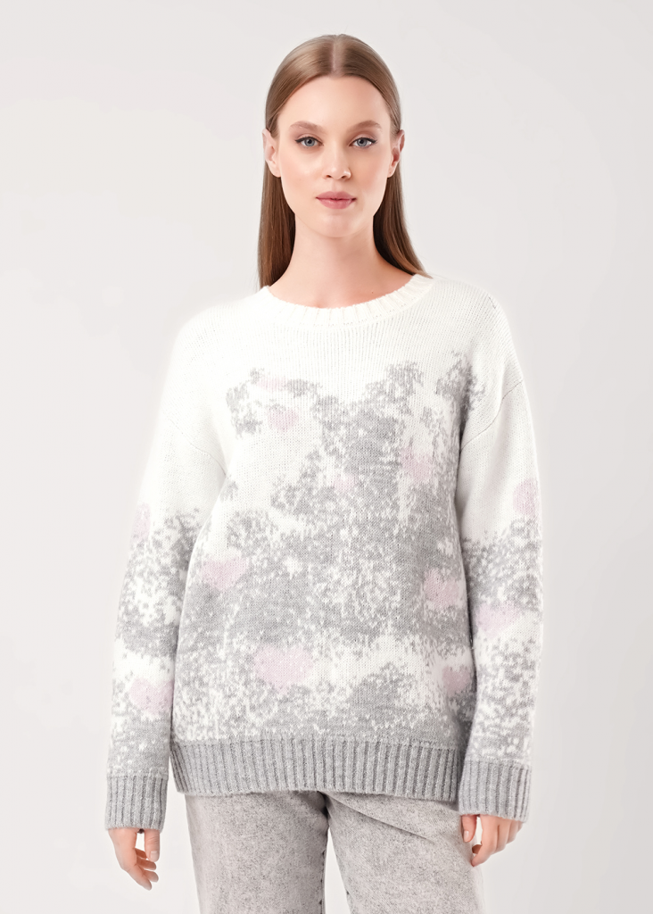 Вязаный джемпер умеренного объема жаккардового переплетения из акриловой пряжи. Спущенный длинный рукав, округлая горловина с бейкой. По низу изделия и рукавов манжеты.