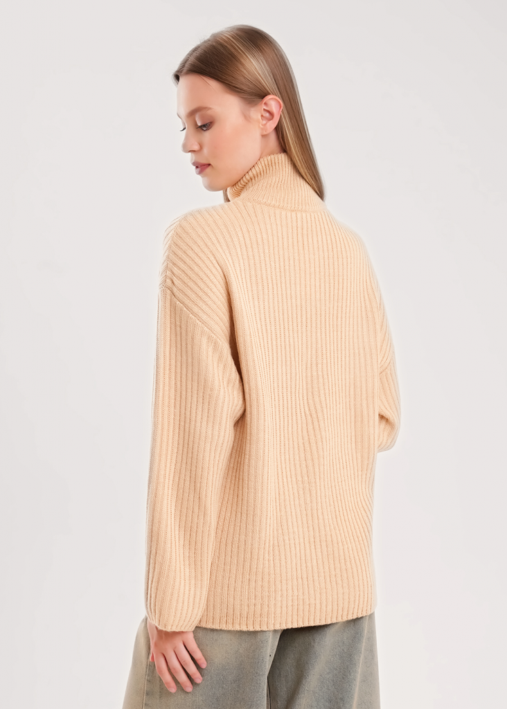 Вязаный джемпер умеренного объема из акриловой пряжи с добавлением шерсти, переплетения полуфанг. Спущенный длинный рукав. По горловине стойка с застежкой на молнию.