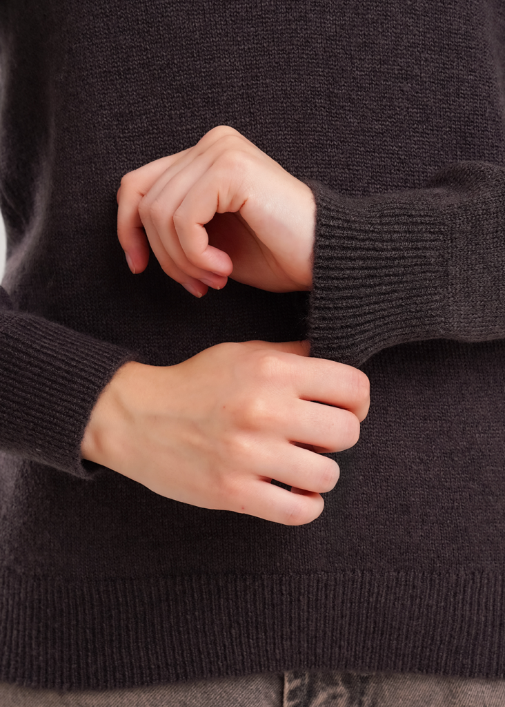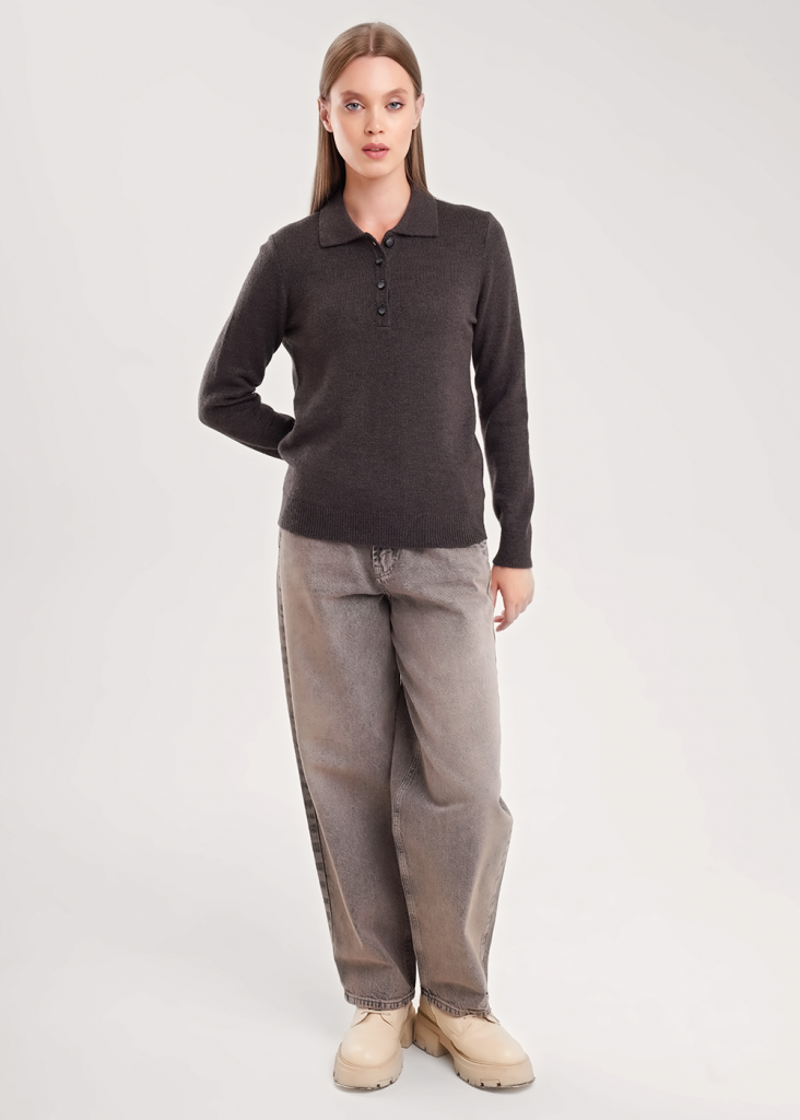 Вязаный джемпер умеренного объема из акриловой пряжи с добавлением шерсти, переплетение гладь. Втачной длинный рукав, по горловине отложной воротник с функциональной планкой и пуговицами. По низу изделия и рукавов манжеты.
