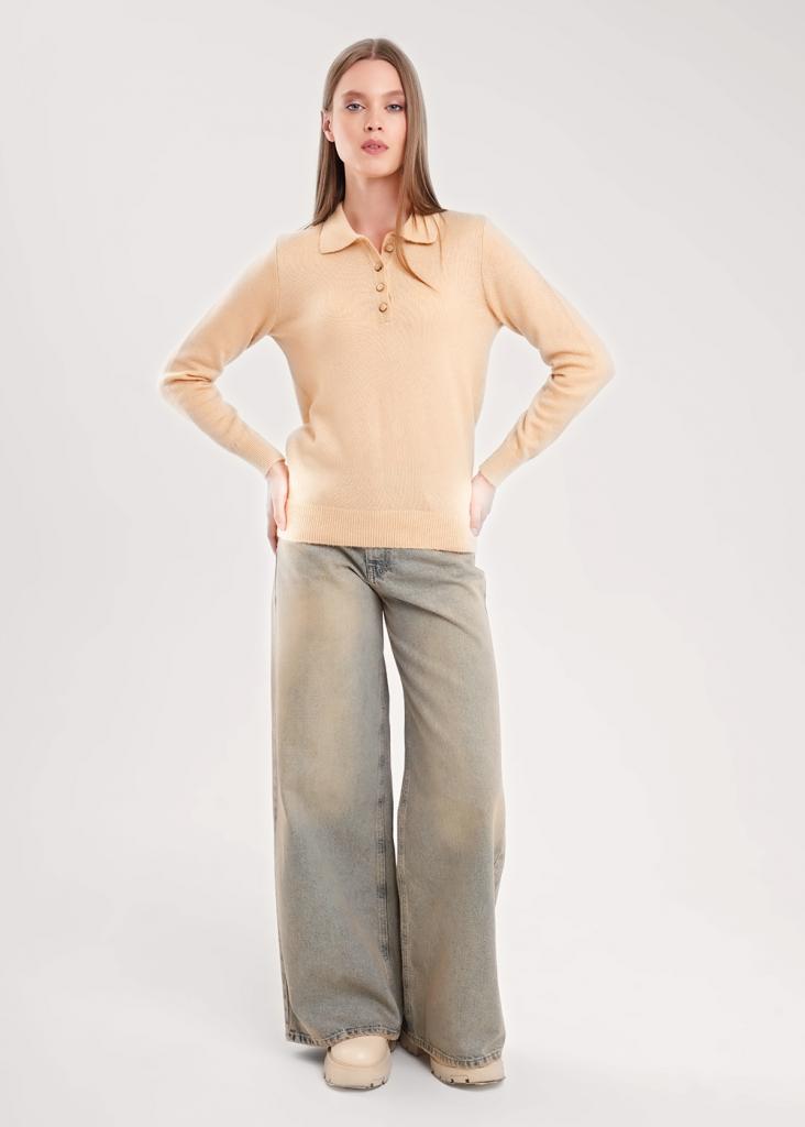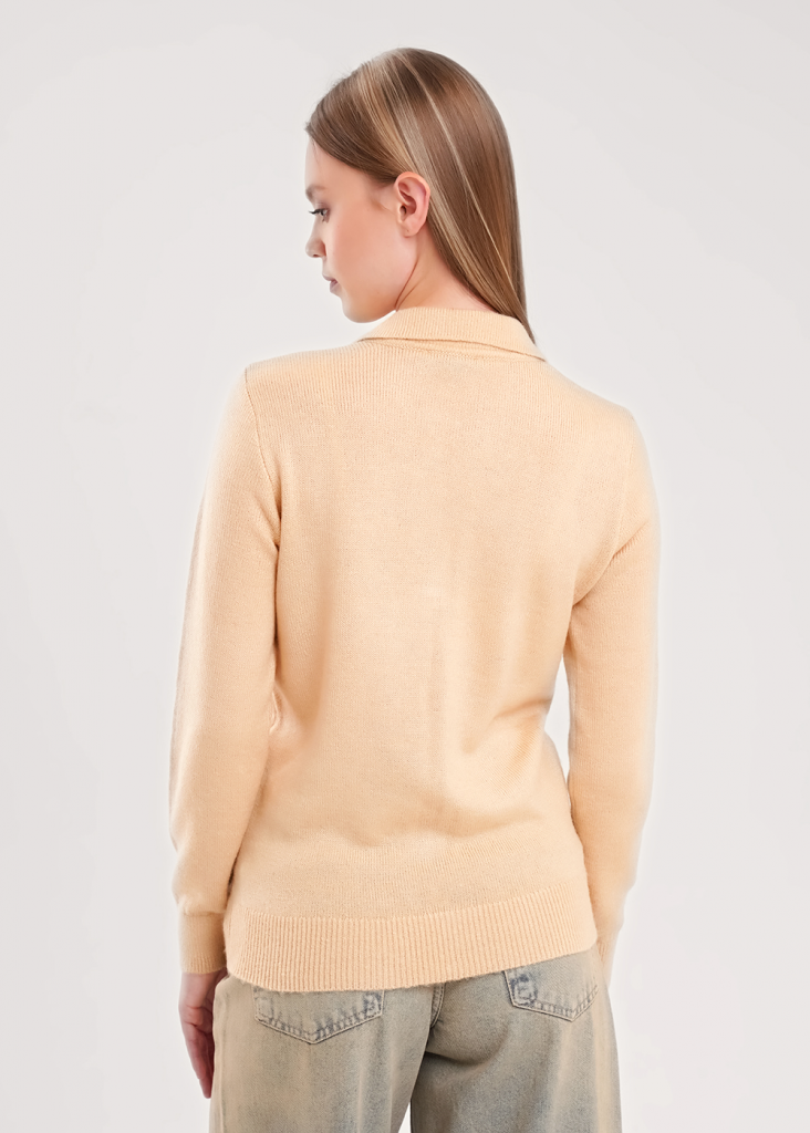 Вязаный джемпер умеренного объема из акриловой пряжи с добавлением шерсти, переплетение гладь. Втачной длинный рукав, по горловине отложной воротник с функциональной планкой и пуговицами. По низу изделия и рукавов манжеты.