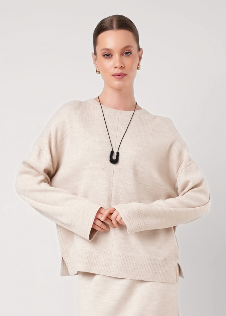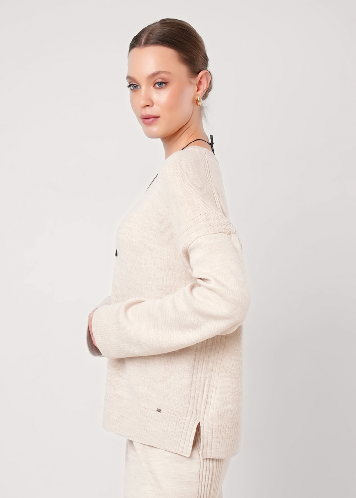 Вязаный джемпер из акриловой пряжи, переплетение гладь,свободного силуэта.Округлая горловина с бейкой. Длинный рукав со спущенной линией плеча.Вертикальные полосы сбоку и пройме. По низу изделия и рукавов широкие манжеты. Боковые разрезы, нашивка металл.