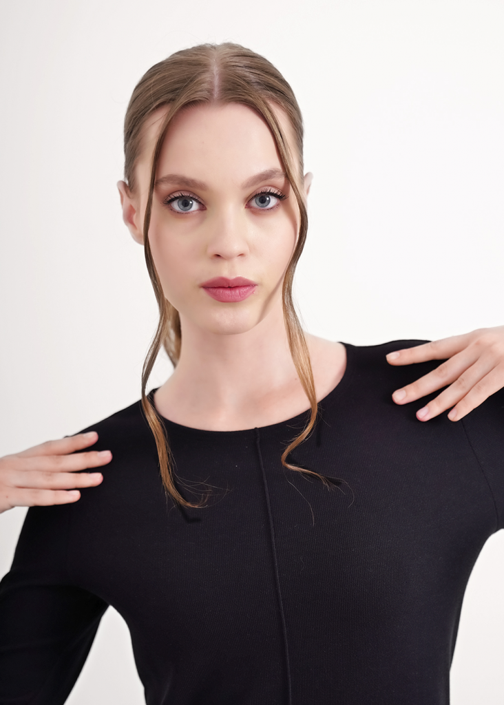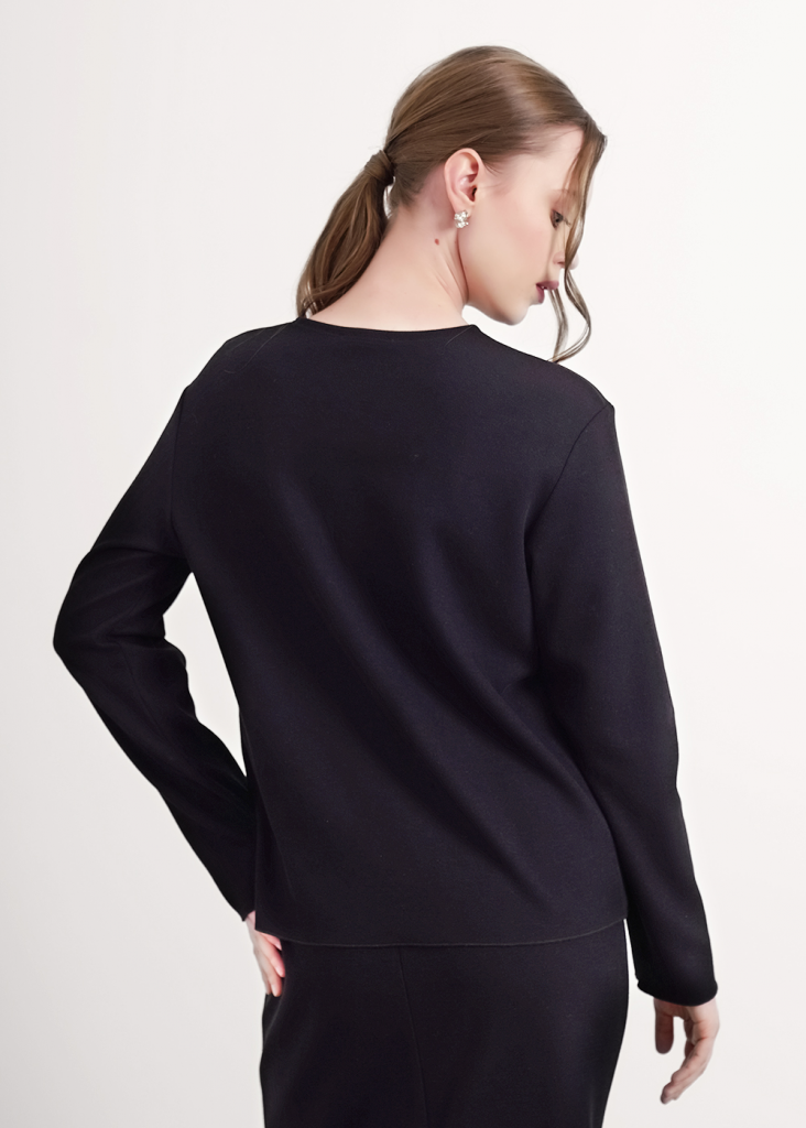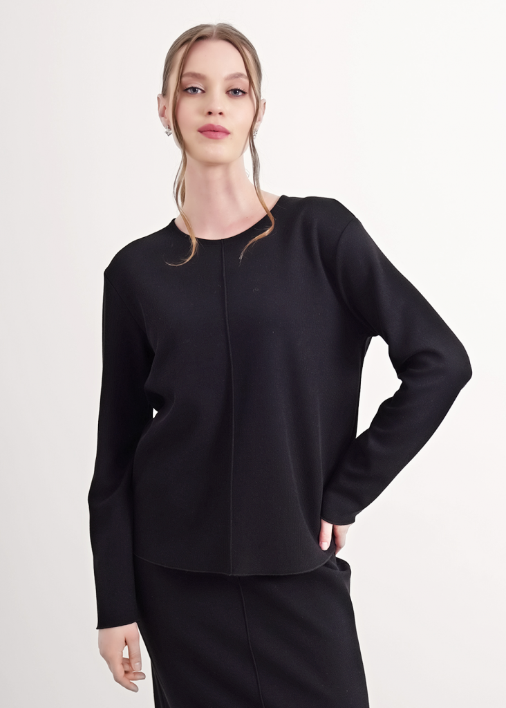 Джемпер прмого силуэта из трикотажного полотна силаник. Округлая горловина. Длинный втачной рукав. По переду вертикальный защип. По низу рукава и изделия мелкий оверлок.