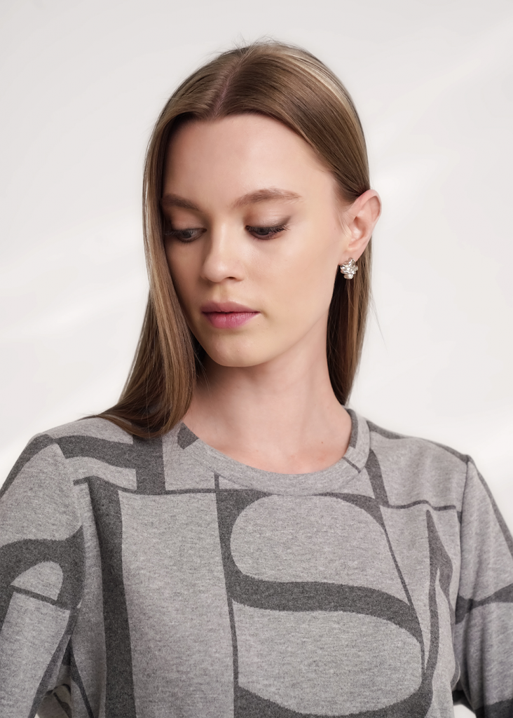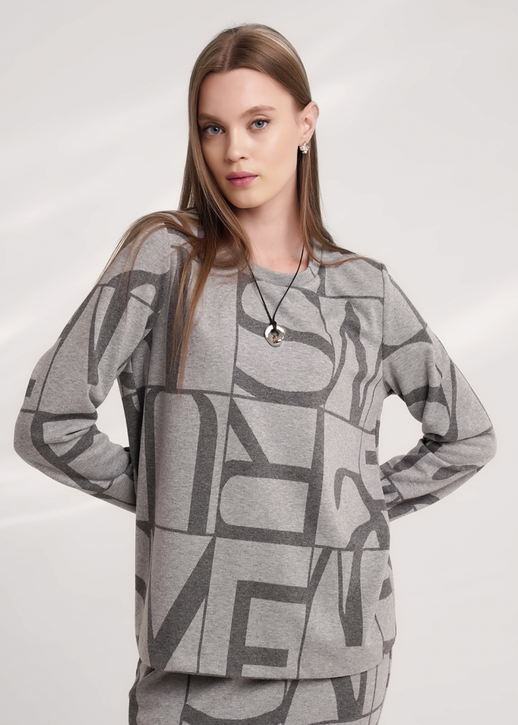 Джемпер из поливискозного трикотажного полотна джерси жаккард, умеренного объема. Длинный втачной рукав. Округлая горловина с обтачкой. По низу рукавов и изделия потайной стежок.
