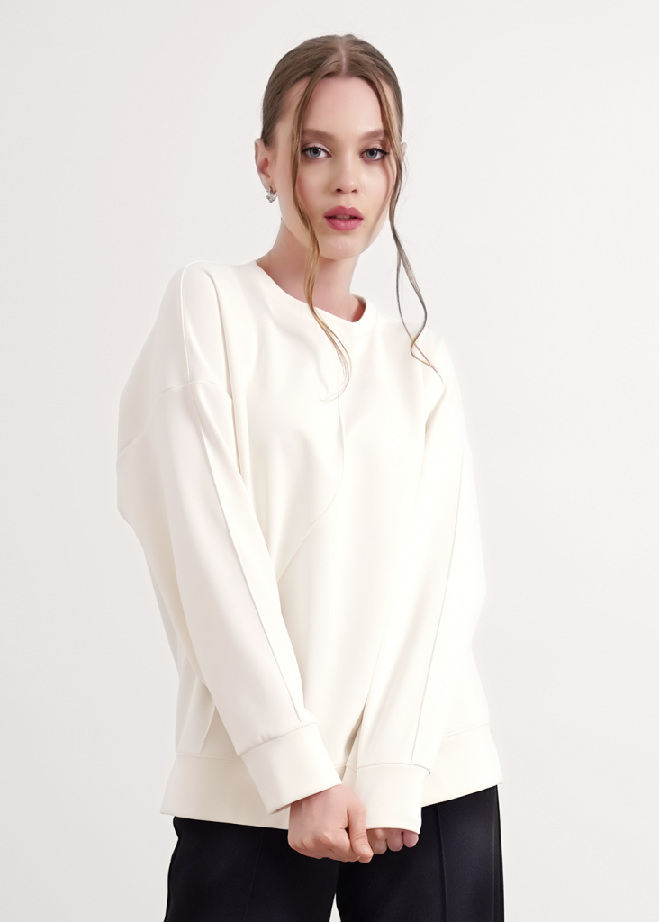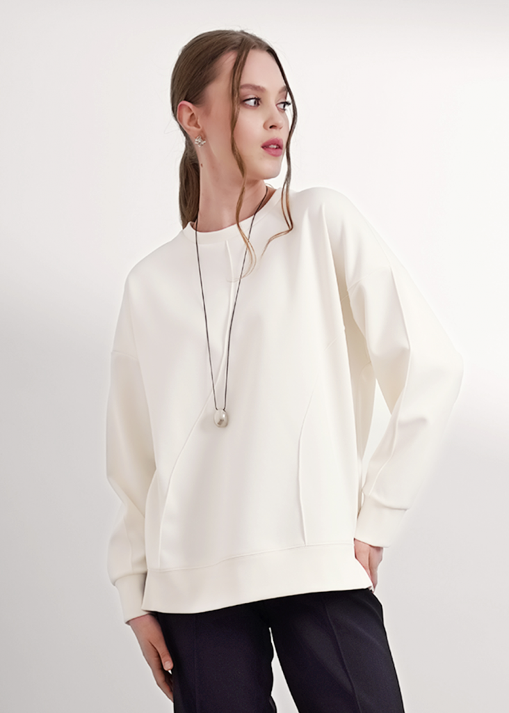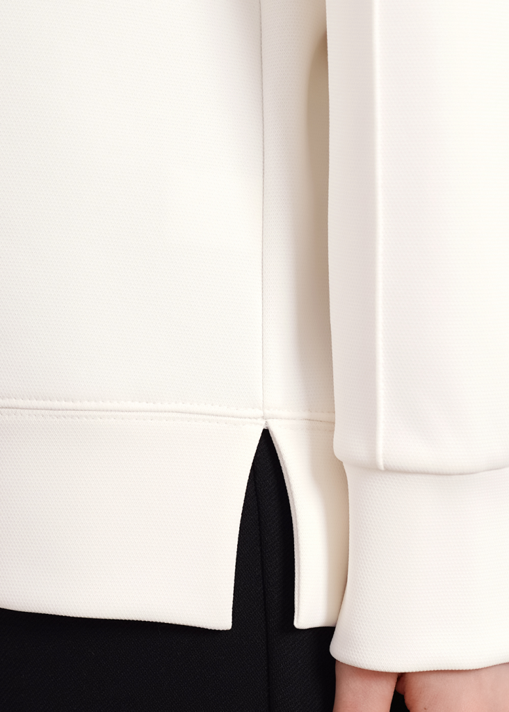 Джемпер из трикотажного полотна джерси фактурное, свободного кроя. Округлая горловина с обтачкой. Длинный рукав со спущенной линией плеча, по низу манжеты. По переду декоративные защипы. По низу изделия манжет с боковыми разрезами.