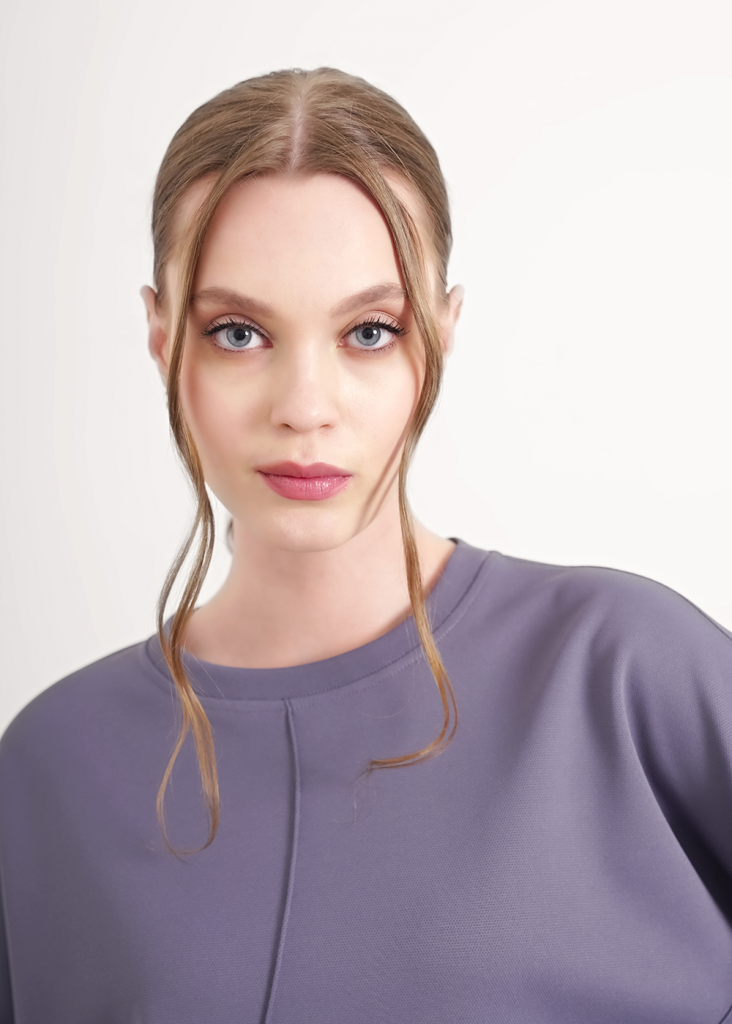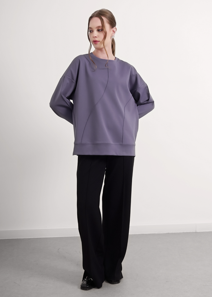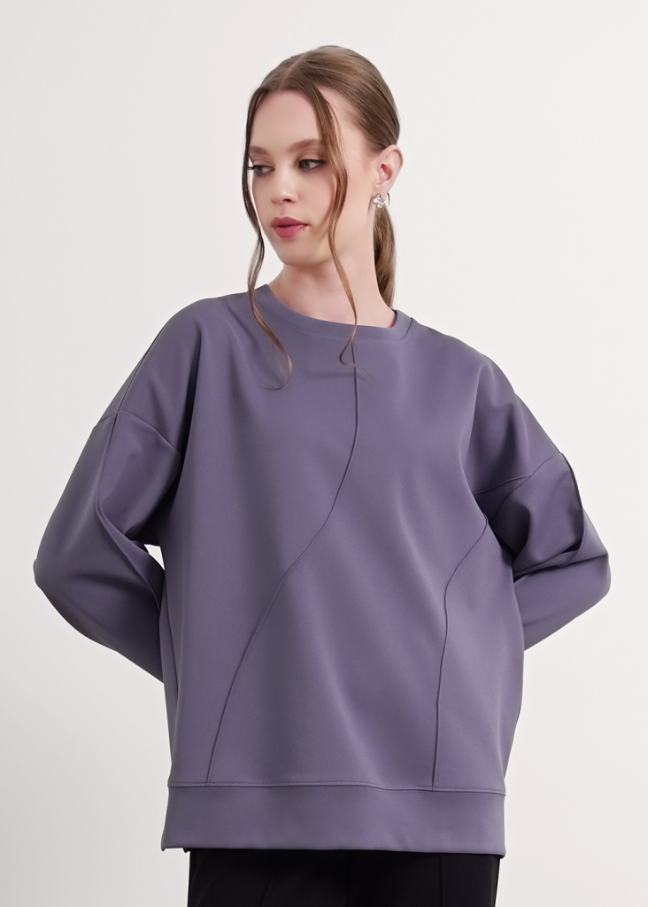 Джемпер из трикотажного полотна джерси фактурное, свободного кроя. Округлая горловина с обтачкой. Длинный рукав со спущенной линией плеча, по низу манжеты. По переду декоративные защипы. По низу изделия манжет с боковыми разрезами.
