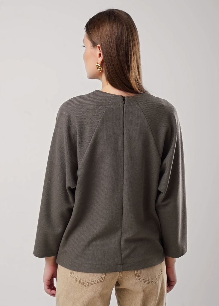 Джемпер свободного кроя из поливискозного трикотажного полотна. Длинный рукав-реглан. Округлая горловина с потайной обтачкой. По спинке потайная молния. По переду вертикальные резы с карманами в шве. Спереди вышивка.