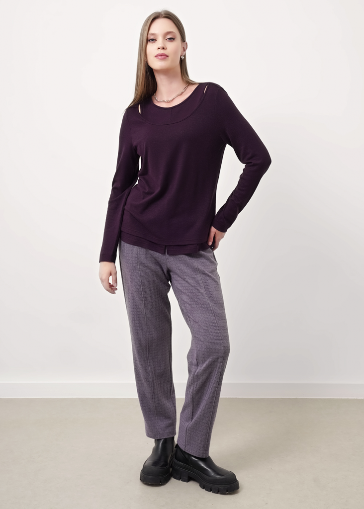 Джемпер из трикотажного полотна вискоза вязанная. Округлая горловина с окантовкой. Втачной длинный рукав. Перед двойной (нижний слой со средним швом и разрезом внизу).