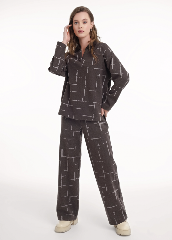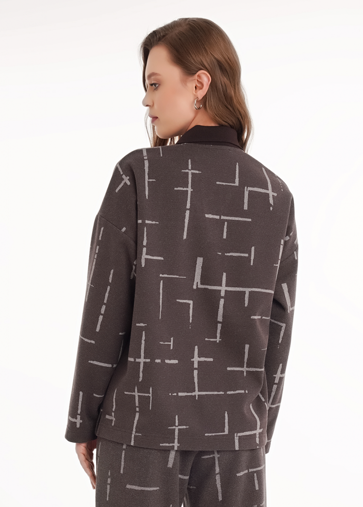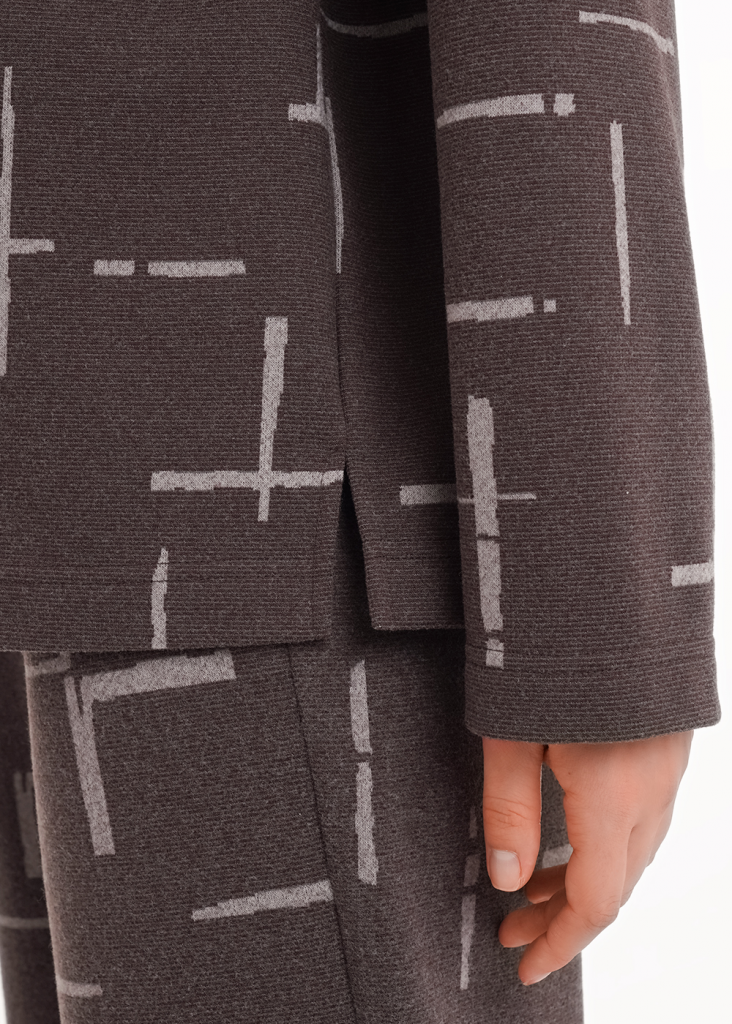 Джемпер прямого силуэта из поливискозного трикотажного полотна джерси. Спущенный длинный рукав. По горловине отложной вязаный воротник с планкой. Боковые разрезы.