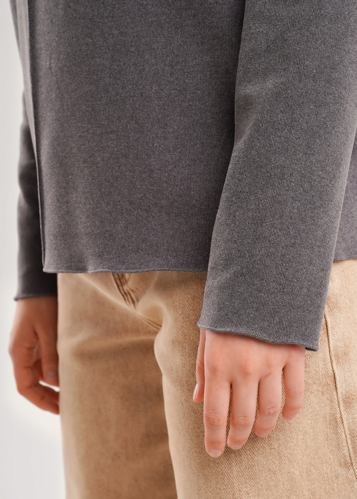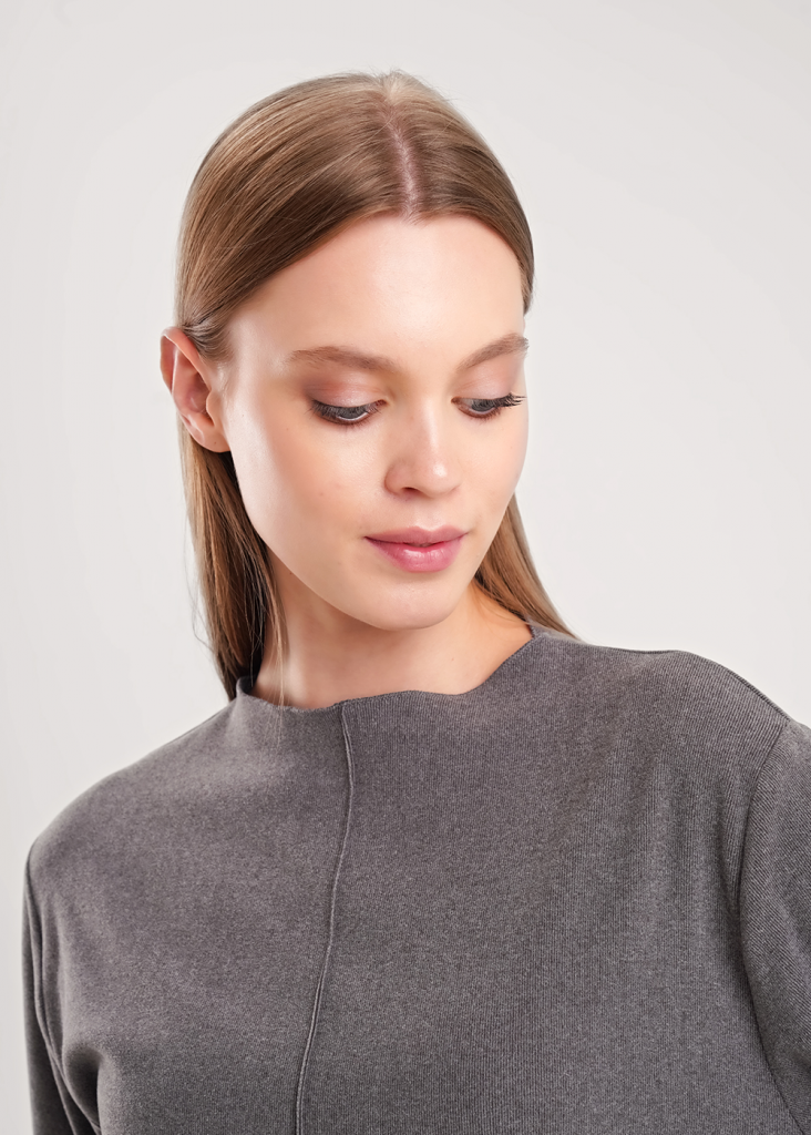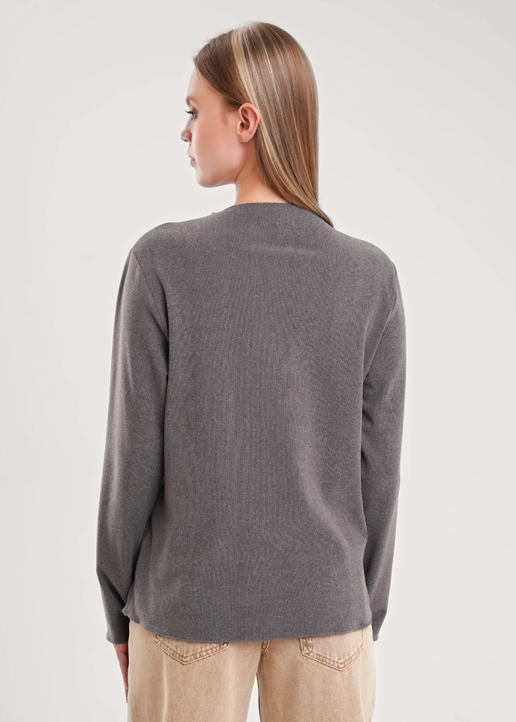 Джемпер прямого кроя из трикотажного полотна интерлок. Втачной длинный рукав. По горловине цельновыкроенная стойка. Спереди защип. По краю стойки, низу рукава и изделия мелкий оверлок.