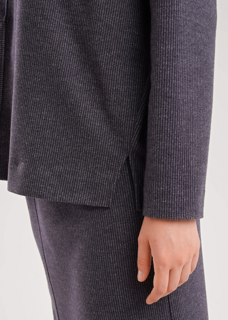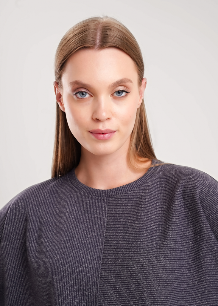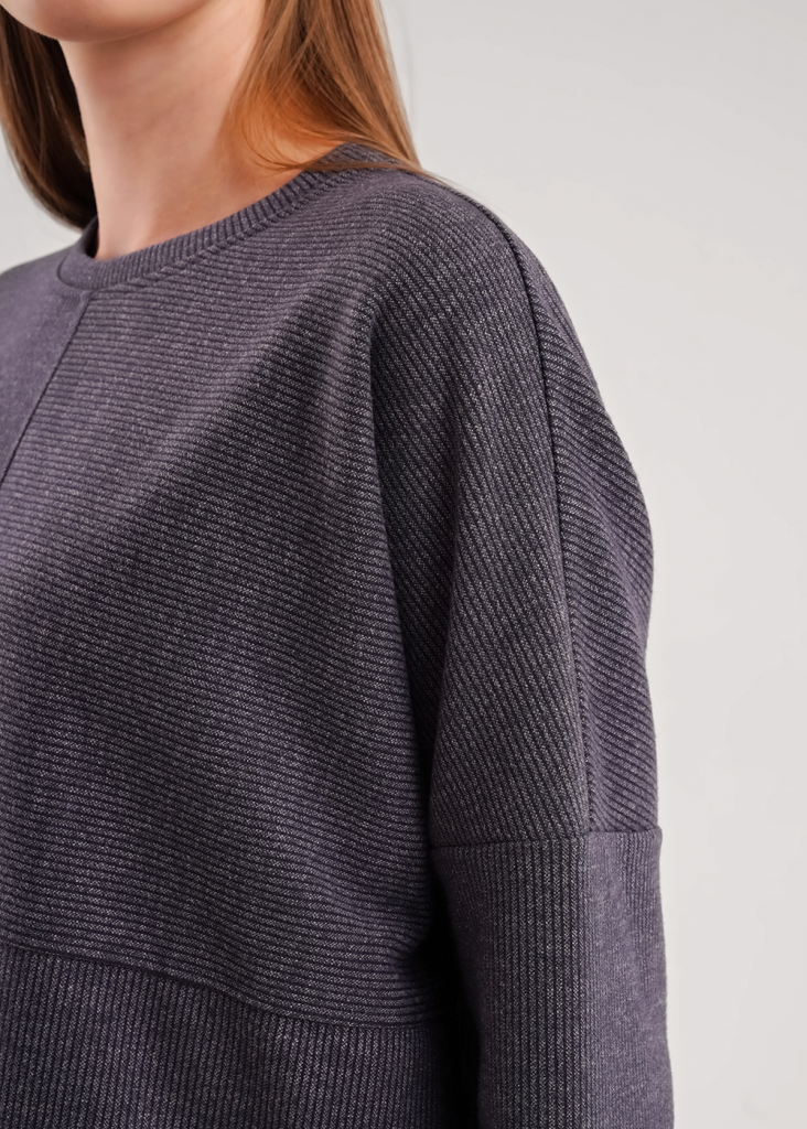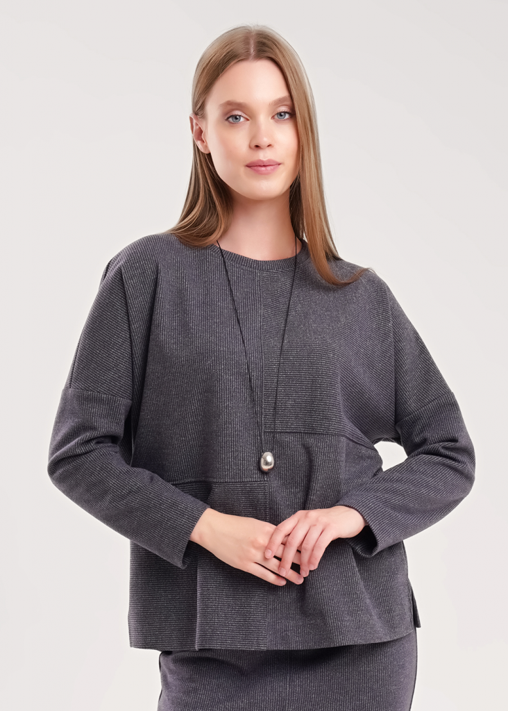 Джемпер свободного кроя из трикотажного поливискозного полотна джерси. Спущенный длинный рукав. Округлая горловина с обтачкой. Спереди резы с разным направлением полос. Боковые разрезы. По низу рукава и изделия потайной стежок.