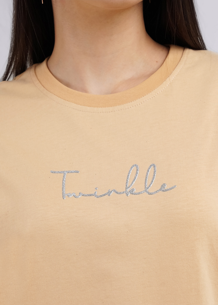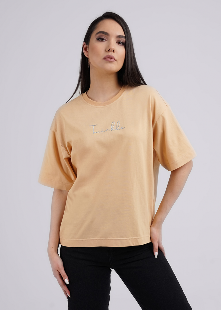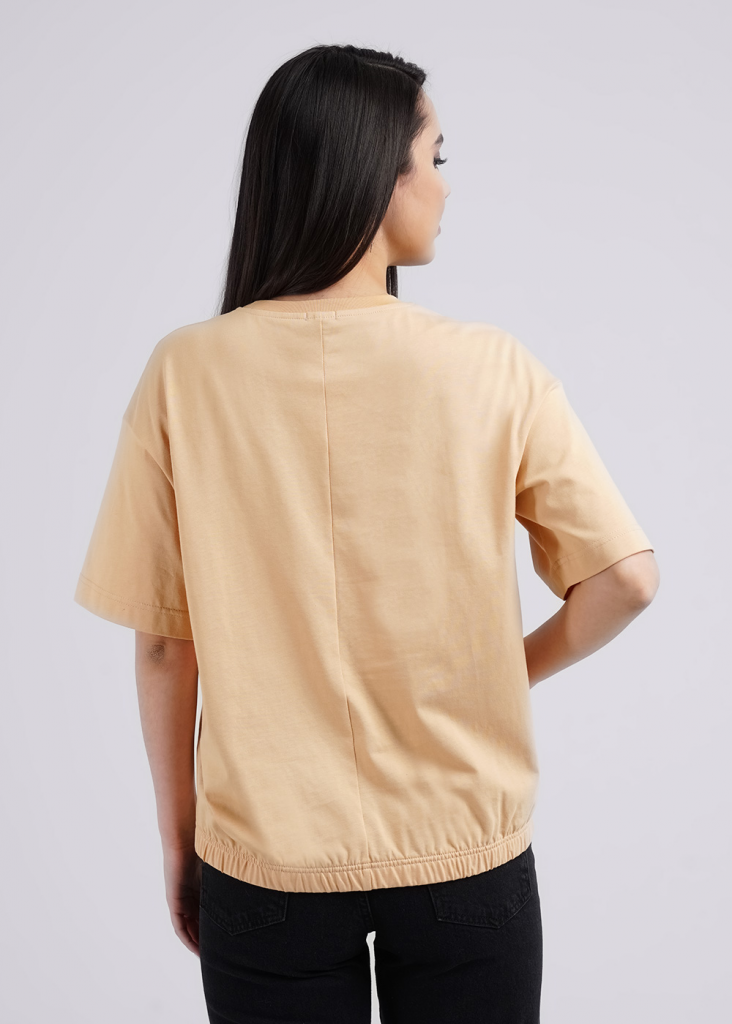 Джемпер из хлопкового трикотажного полотна. Короткий спущенный рукав. Круглый вырез горловины обработан рибаной. По спинке средний шов и пояс на резинке. По переду термонаклейка.