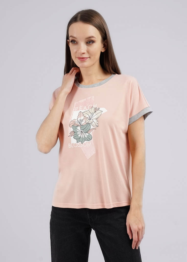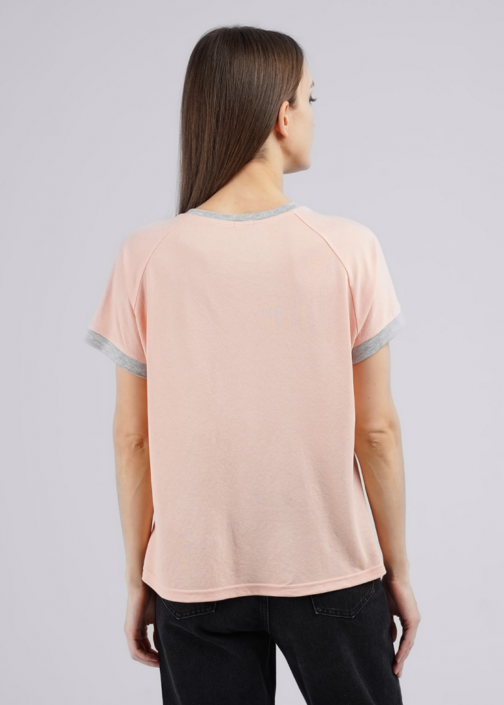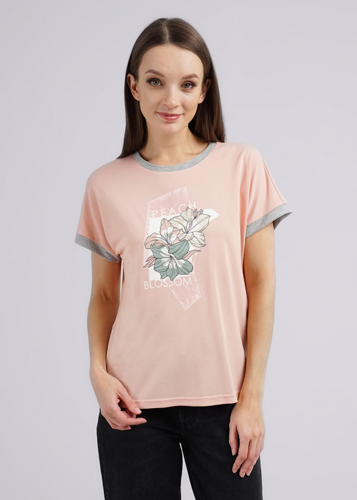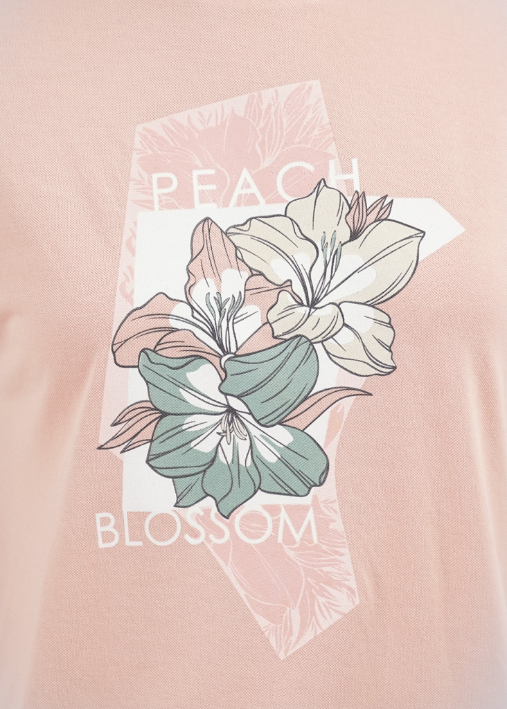 Джемпер из трикотажного полотна "пике" с вискозой в составе. Короткий цельнокроеный рукав. Круглый вырез горловины. Манжеты и обтачка выполнены из трикотажного полотна с блеском. По переду принт.