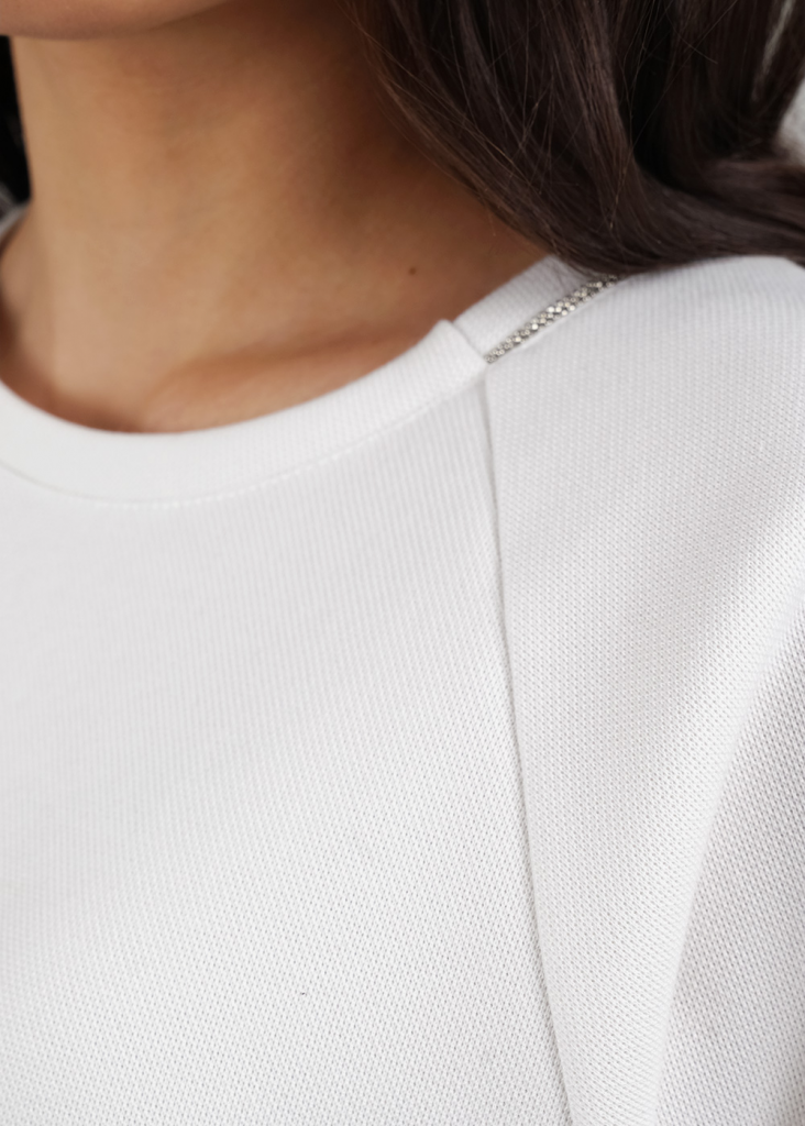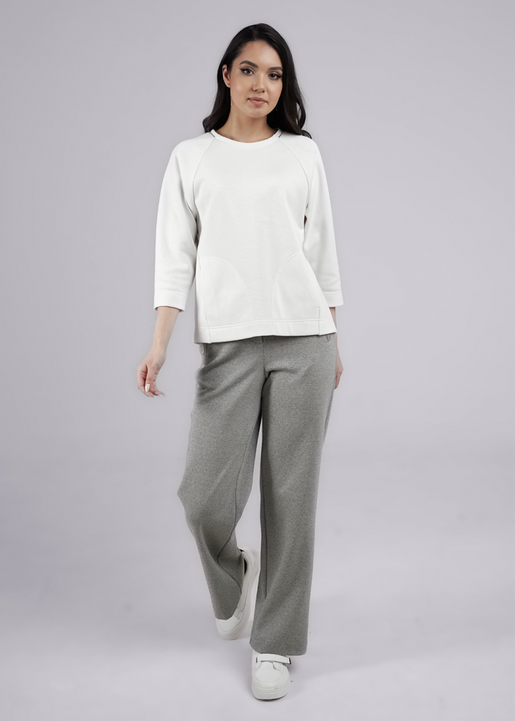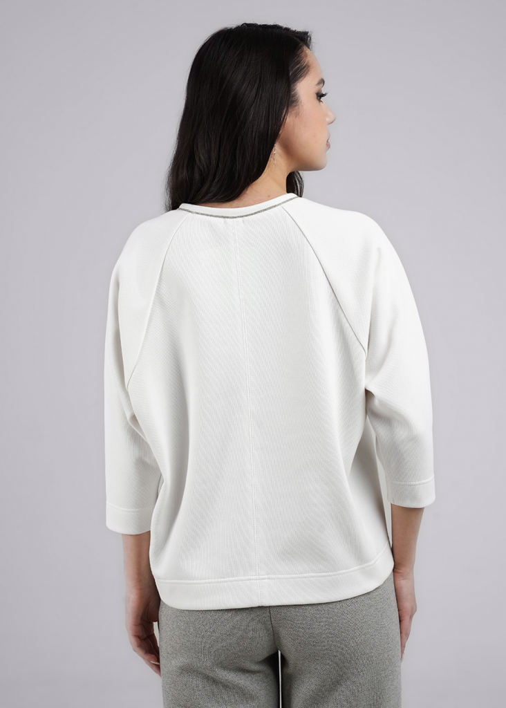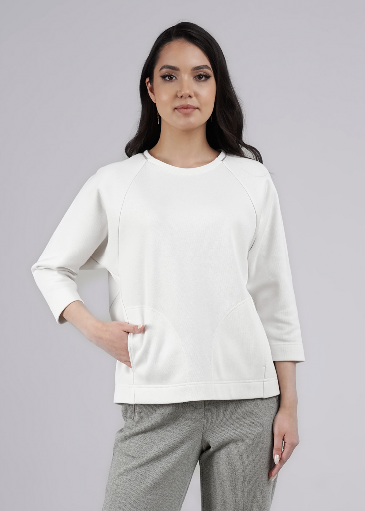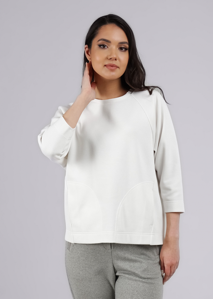 Джемпер из плотного трикотажного полотна. Рукав реглан длиной 7/8. Круглая форма горловины декорирована тесьмой. По переду рельефы и карманы. По спинке средний шов.