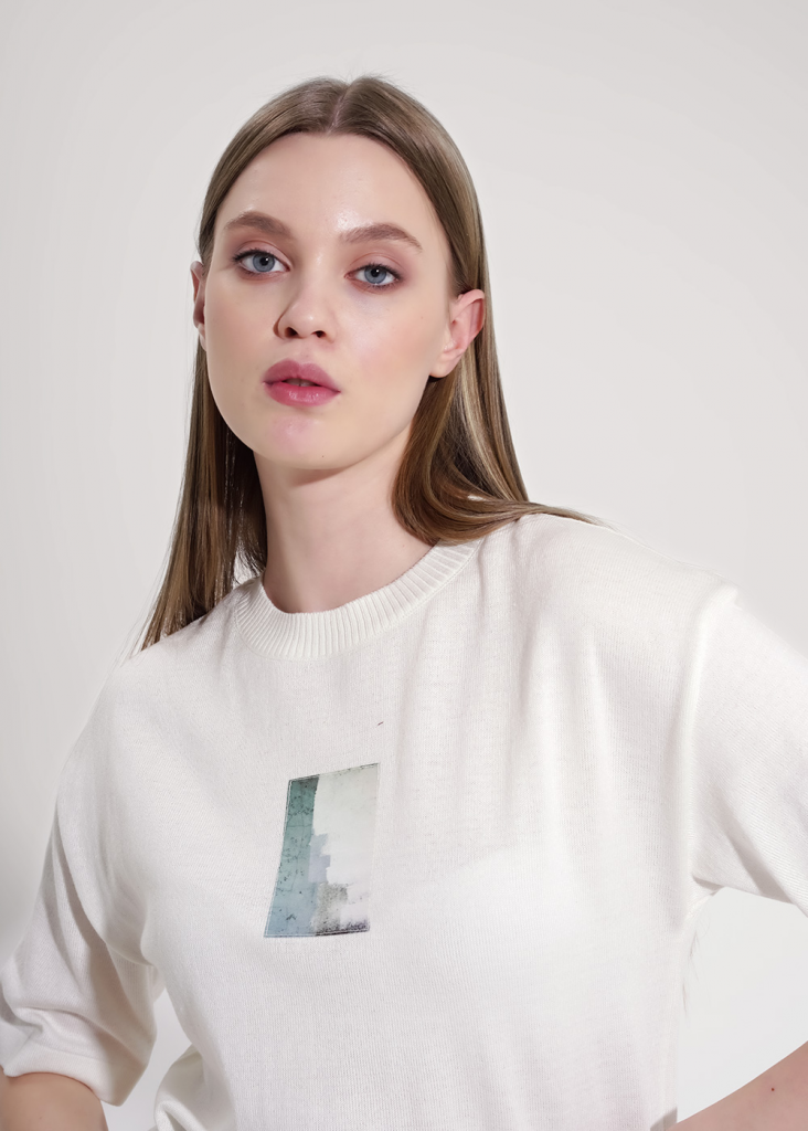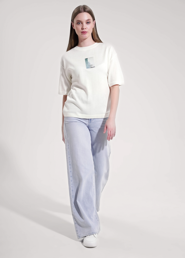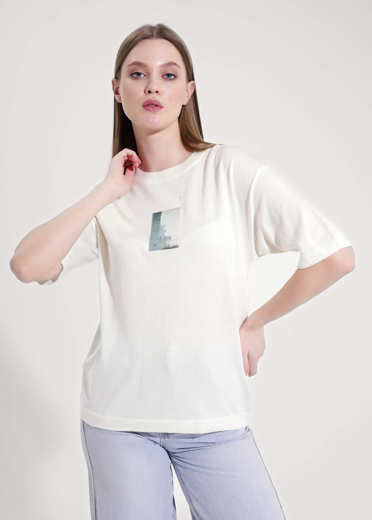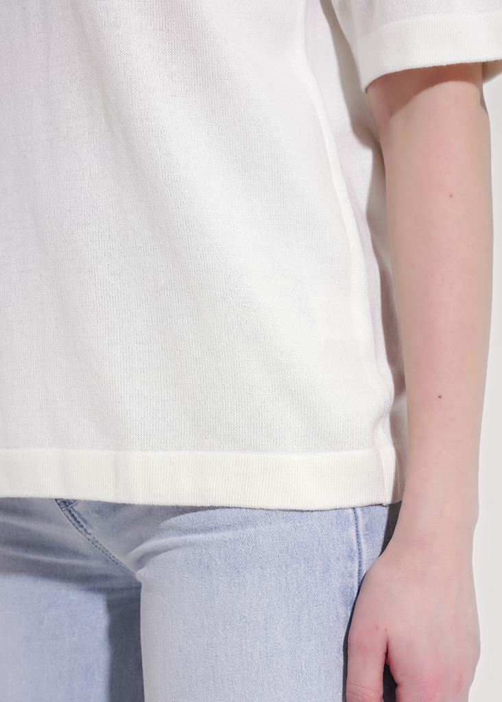 Вязаный джемпер умеренного объема из хлопковой пряжи с добавлением акрила. Короткий рукав со спущенной линией плеча. Длина рукава до локтя. Округлая горловина с бейкой. На детали переда нашивка.