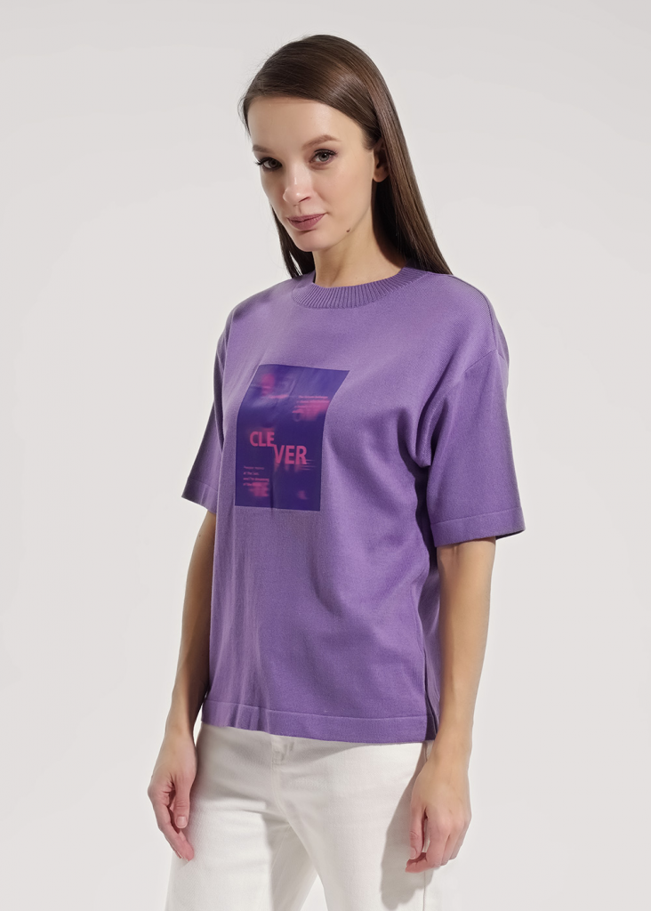Вязаный джемпер умеренного объема из хлопковой пряжи с добавлением акрила. Короткий рукав со спущенной линией плеча. Длина рукава до локтя. Округлая горловина с бейкой. На детали переда термонаклейка.