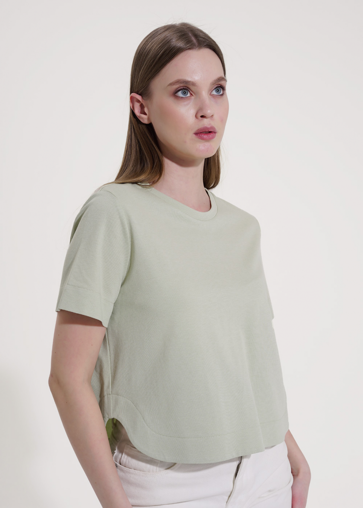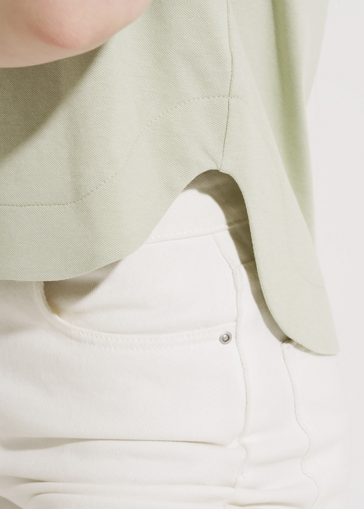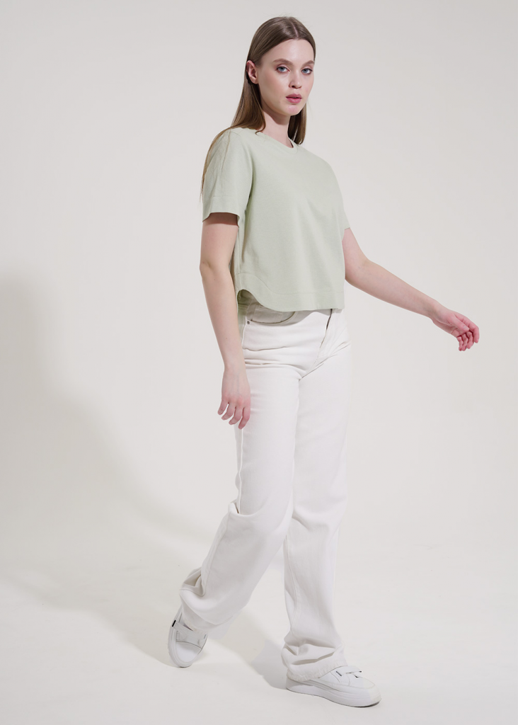 Джемпер из трикотажного полотна "пике", прямого силуэта. Втачной короткий рукав. Округлая горловина с обтачкой. Ассиметричный фигурный низ с обтачкой. На детали спинки нашивка.
