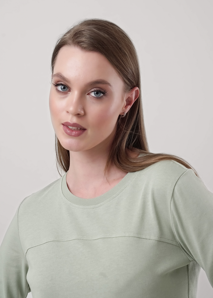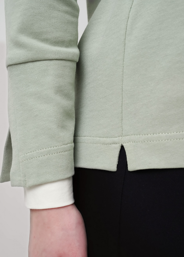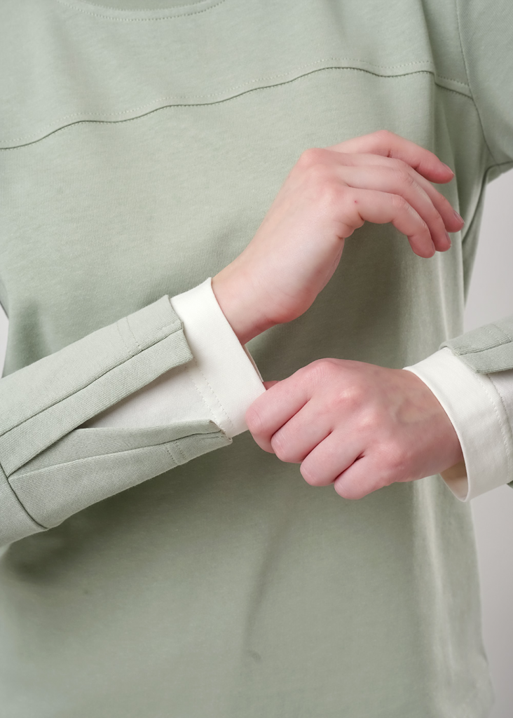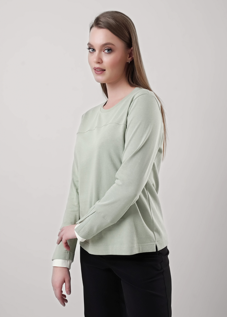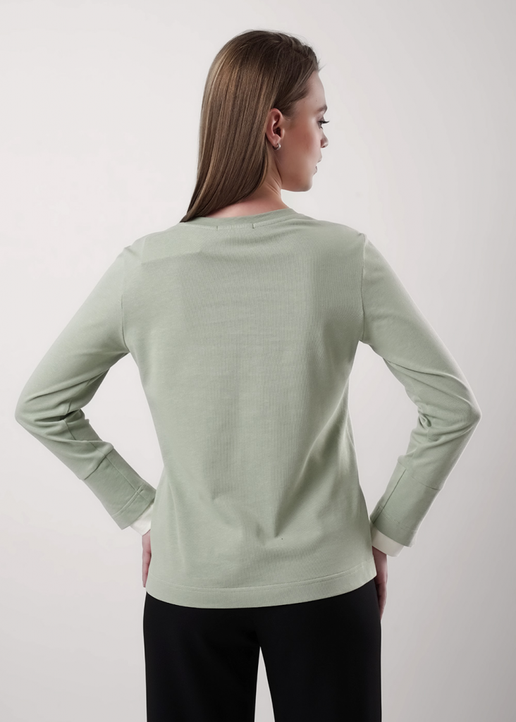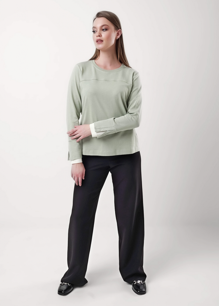 Джемпер прямого силуэта из плотного хлопкового трикотажного полотна с втачным длинным рукавом. Округлая горловина с обтачкой. По переду горизонтальный рез. По низу рукава шлица с внутренней контрастной манжетой.