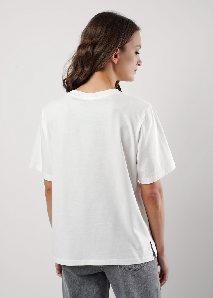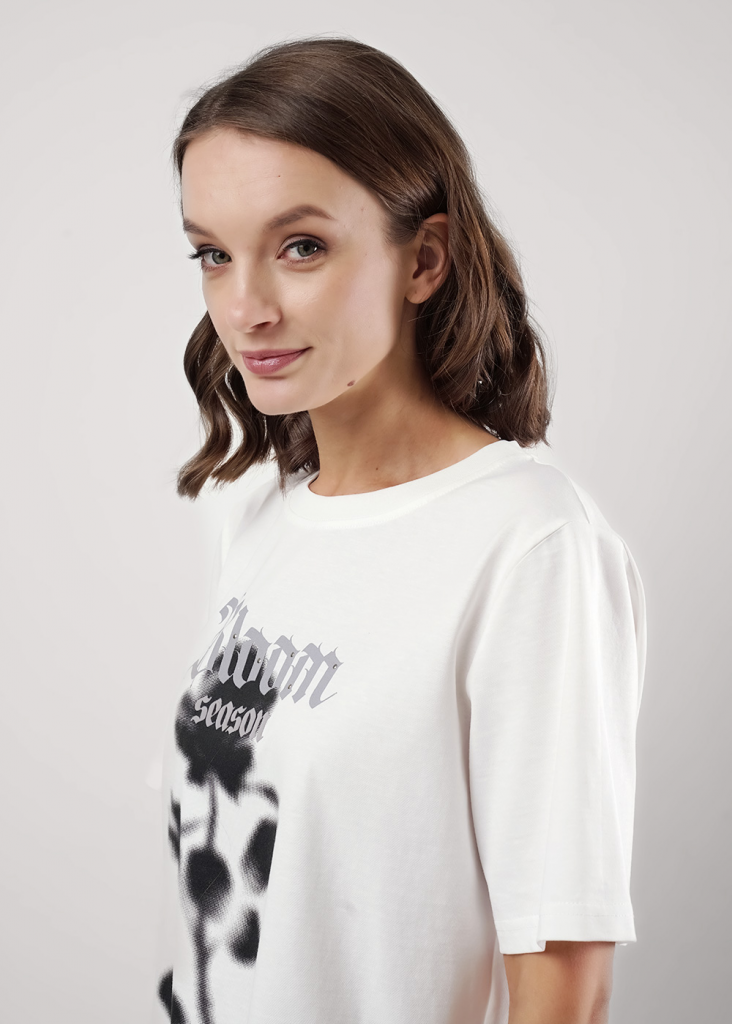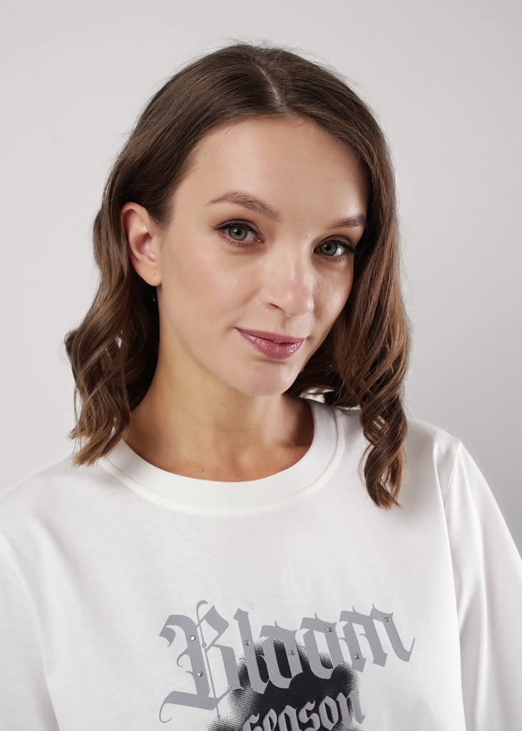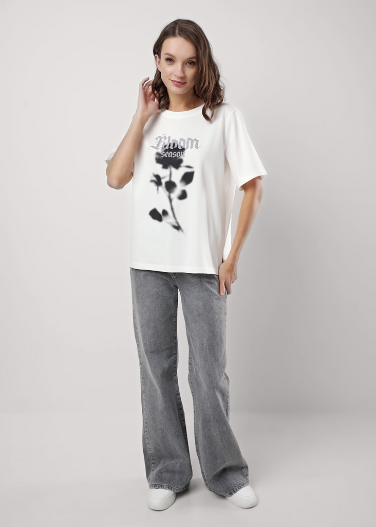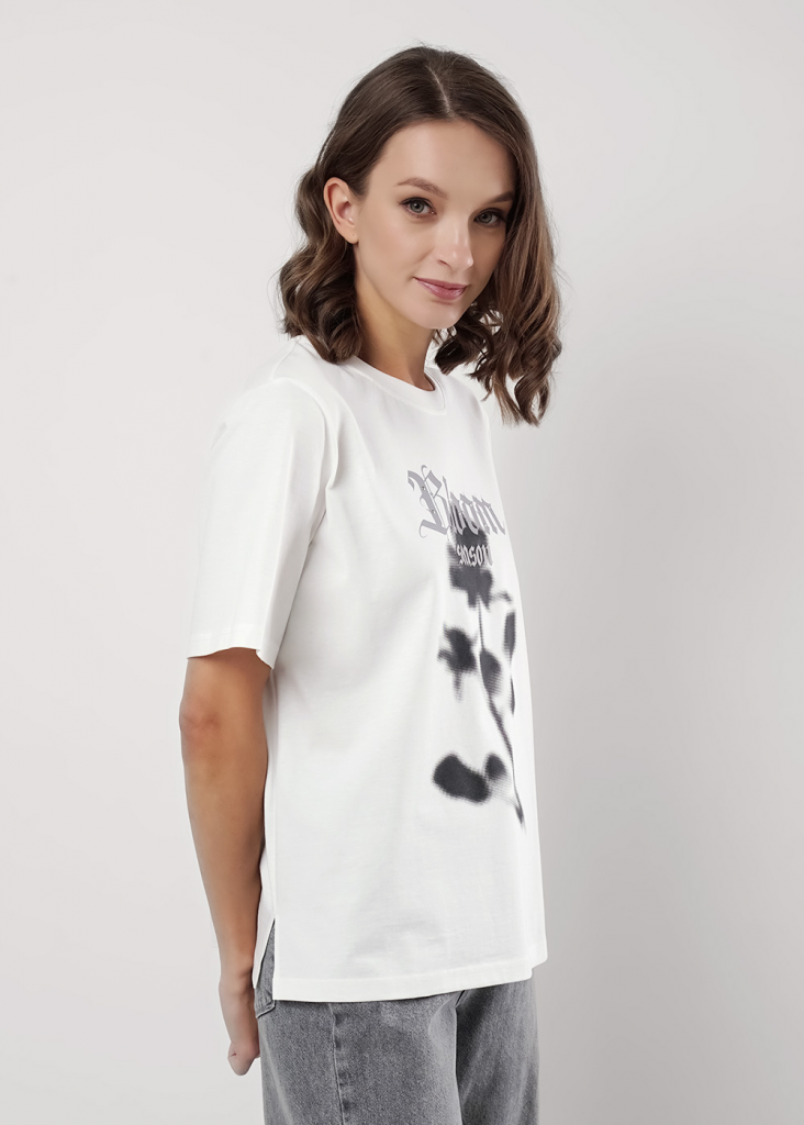 Джемпер оверсайз из хлопкового трикотажного полотна. Округлая горловина с обтачкой из рибаны, втачной короткий рукав. По бокам разрезы. Спереди принт вспенка с хольнитенами.