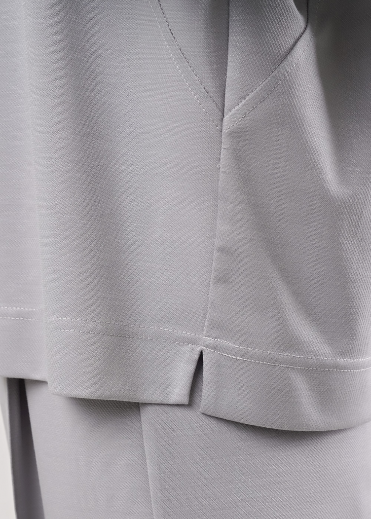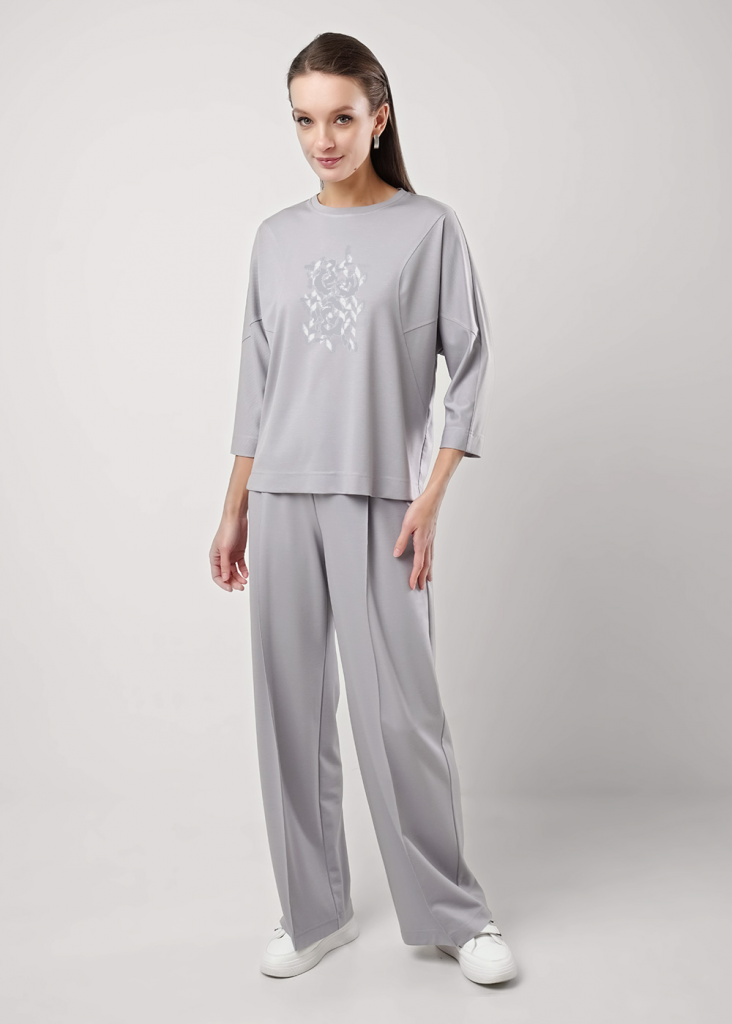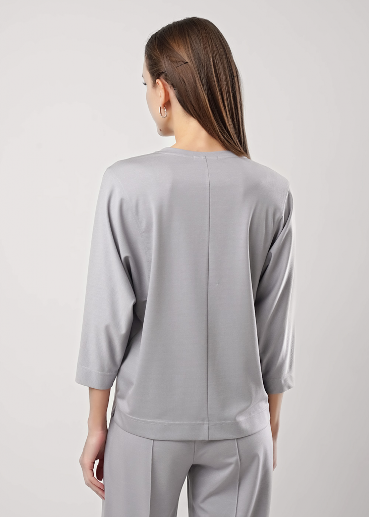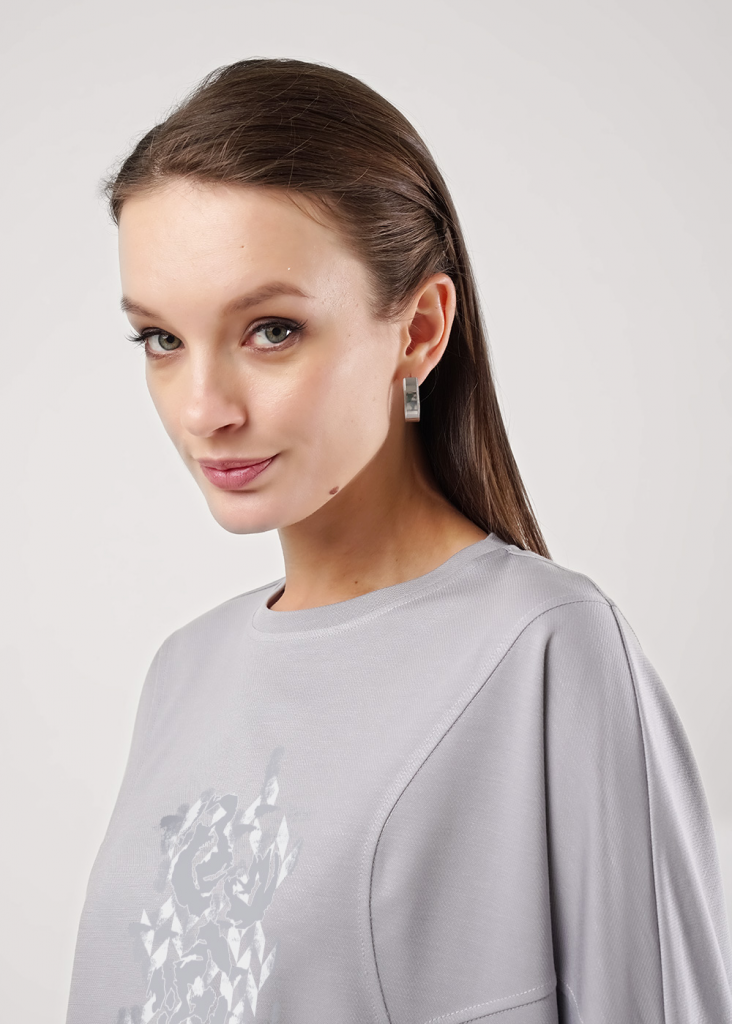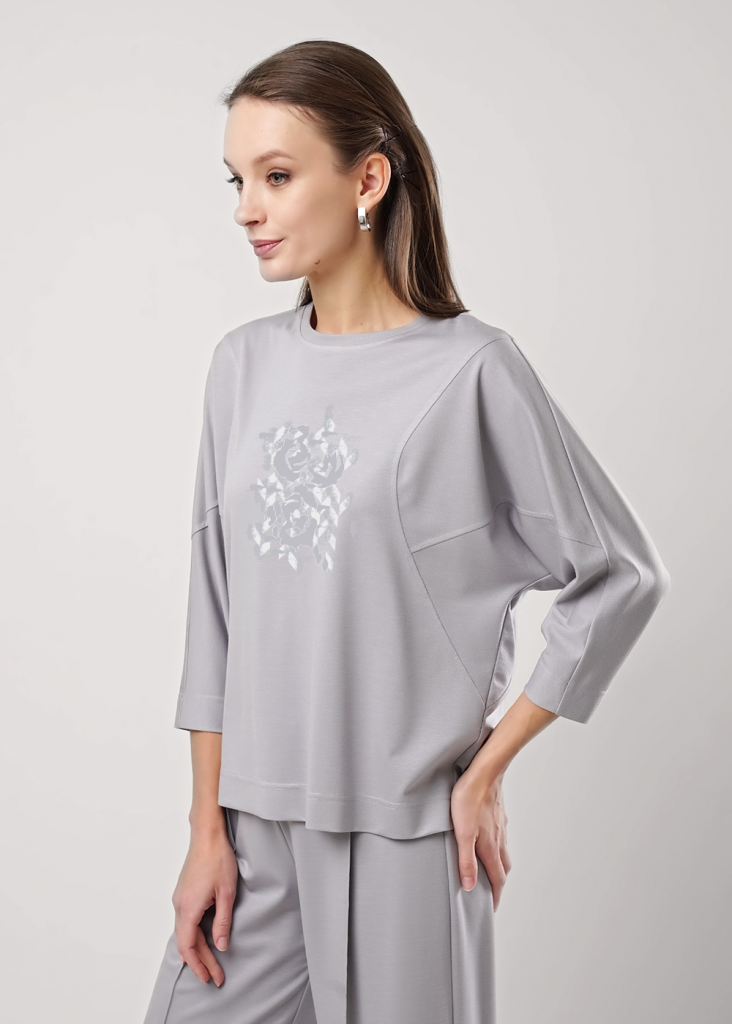 Джемпер свободного кроя из вискозного трикотажного полотна. Округлая горловина с обтачкой. Цельнокроеный рукав длиной 3/4. По переду и спинке отстроченные резы. По спинке средний шов. По бокам небольшие разрезы. Спереди принт фольга.