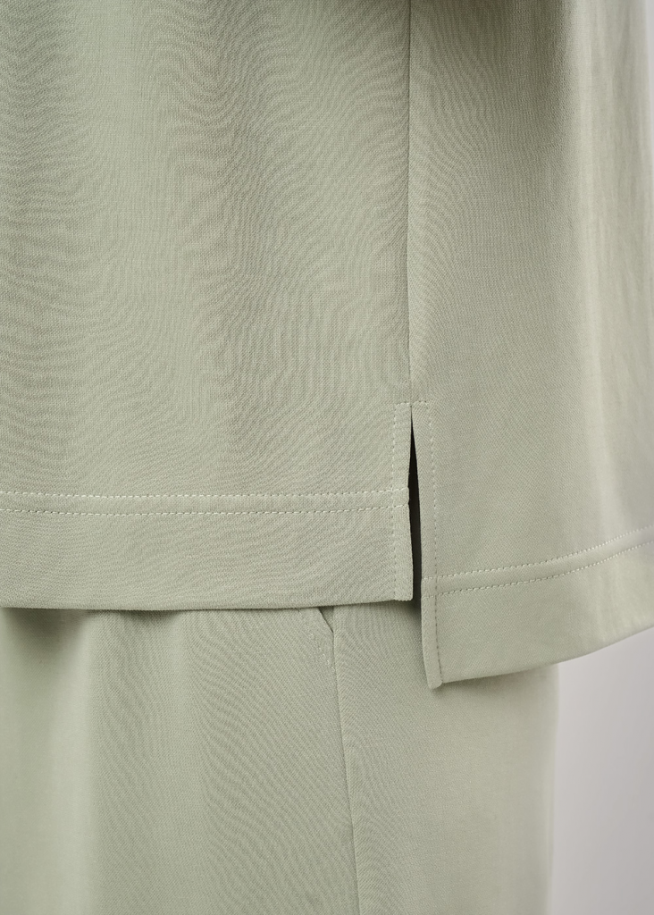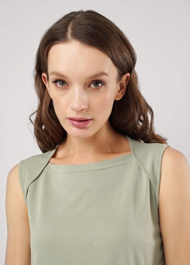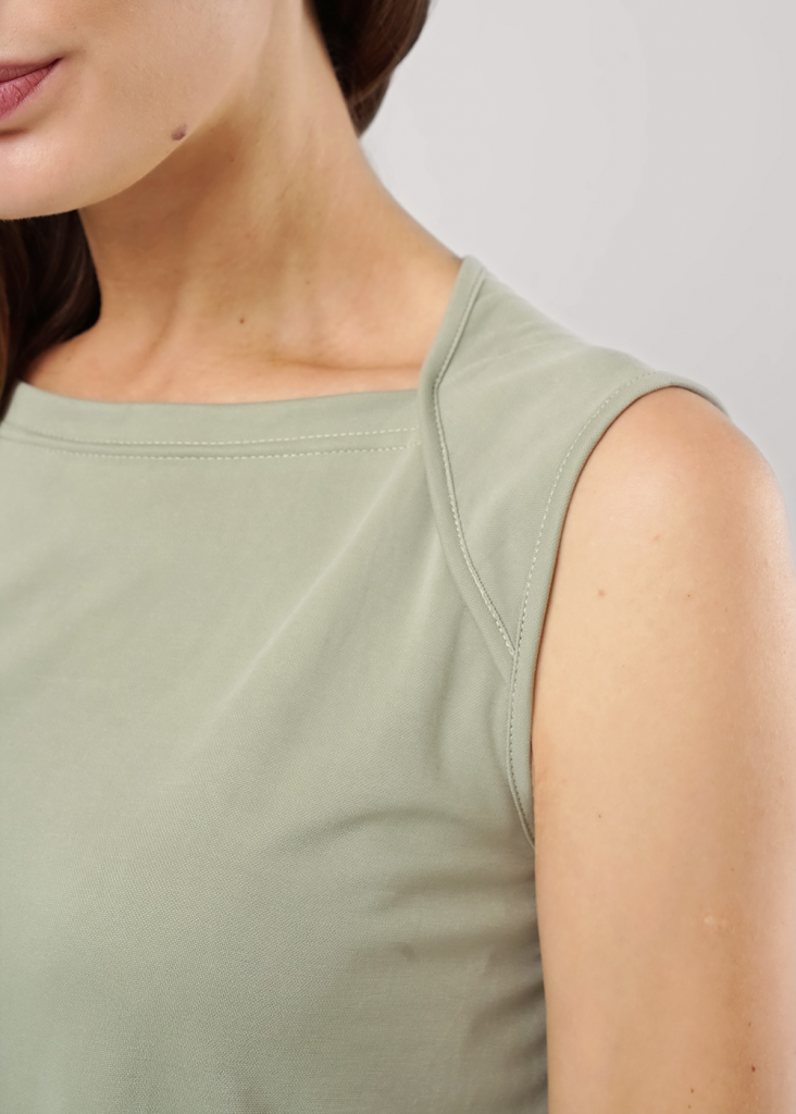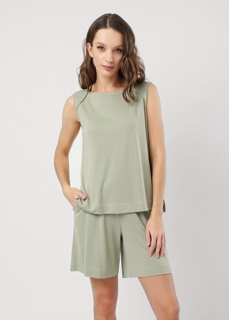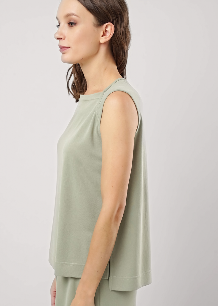 Джемпер без рукавов широкое плечо, из вискозного трикотажного полотна пике прямого силуэта. По горловине спинки и пройме окантовка. Боковые разрезы, внизу нашивка металл.
