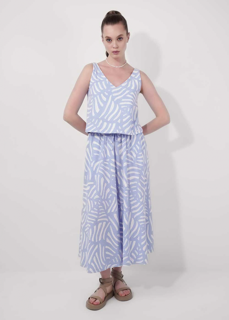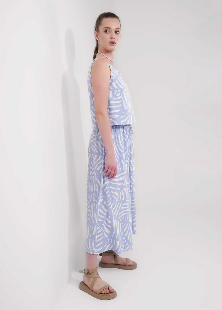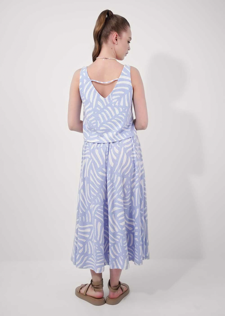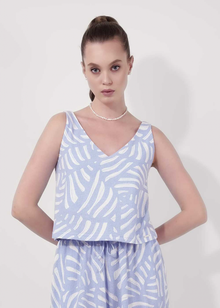 Джемпер без рукавов из фактурного трикотажного полотна джерси, среднее плечо. V-образный вырез грловины,по спинке узкая перемычка из окантовки. Перед и спинка двойные, спереди нашивка дерево.