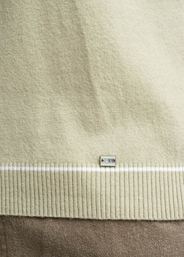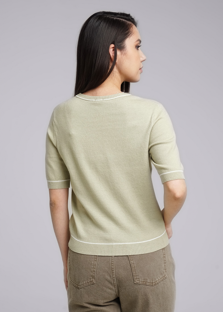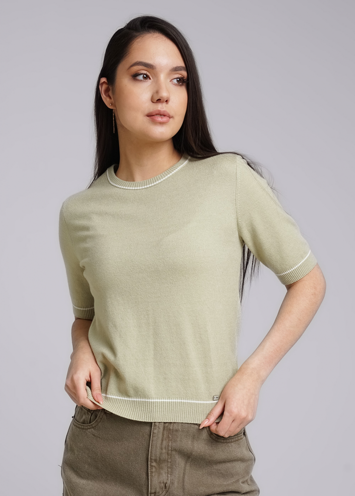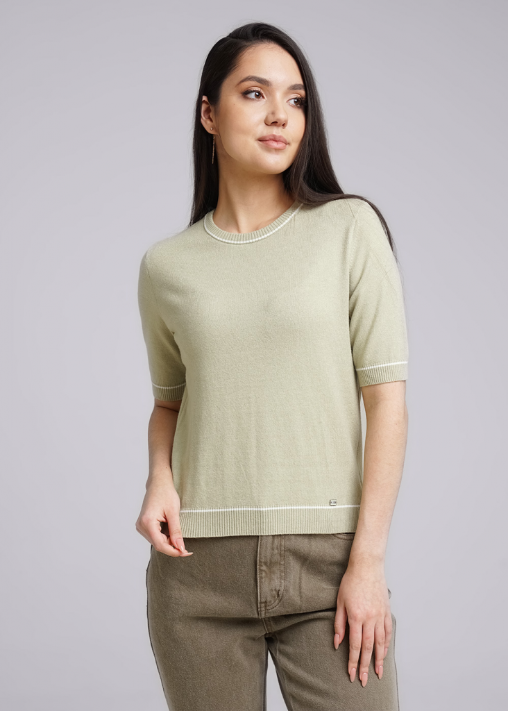 Укороченный вязаный джемпер умеренного объема из вискозной пряжи с полиэстером. Округлая горловина, по горловине бейка. Втачной короткий рукав. По низу изделия, рукавов манжеты. Бейка и манжеты декорированы контрастной полоской, спереди нашивка.