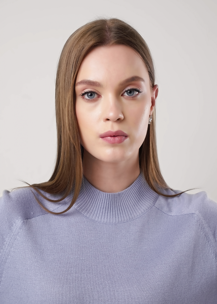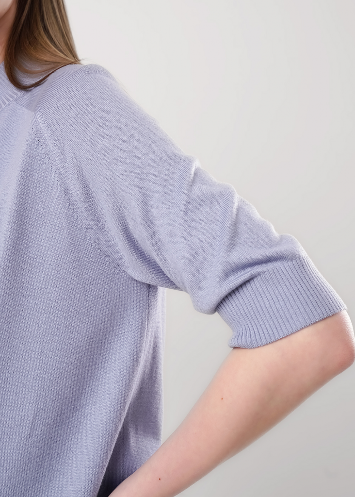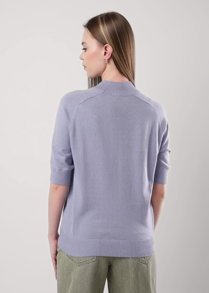 Вязаный джемпер прямого силуэта акриловой пряжи с добавлением хлопка, переплетение гладь. Короткий рукав реглан. Округлая горловина с полустойкой. По низу изделия и рукавов манжеты.