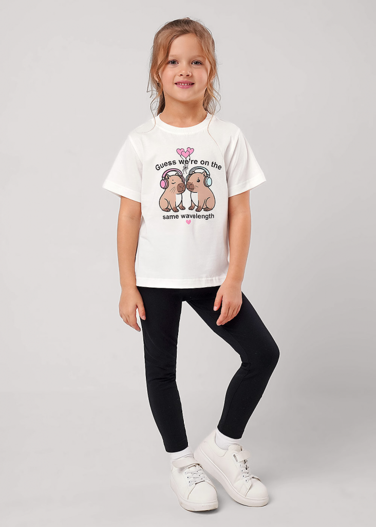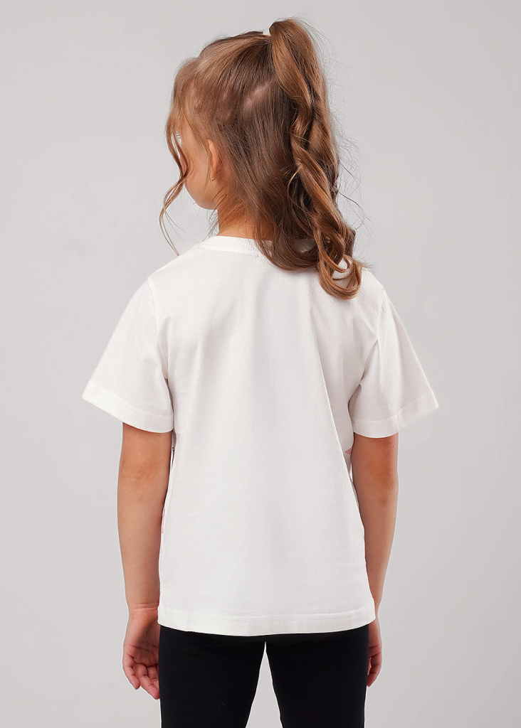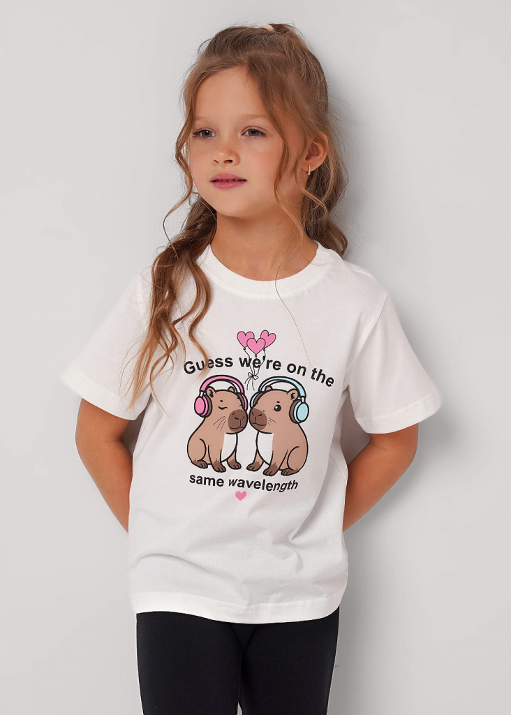 Базовая футболка из 100% хлопка- незаменимая вещь в гардеробе каждой юной модницы! Качественные материалы, комфортная посадка по фигуре и милый принт!
