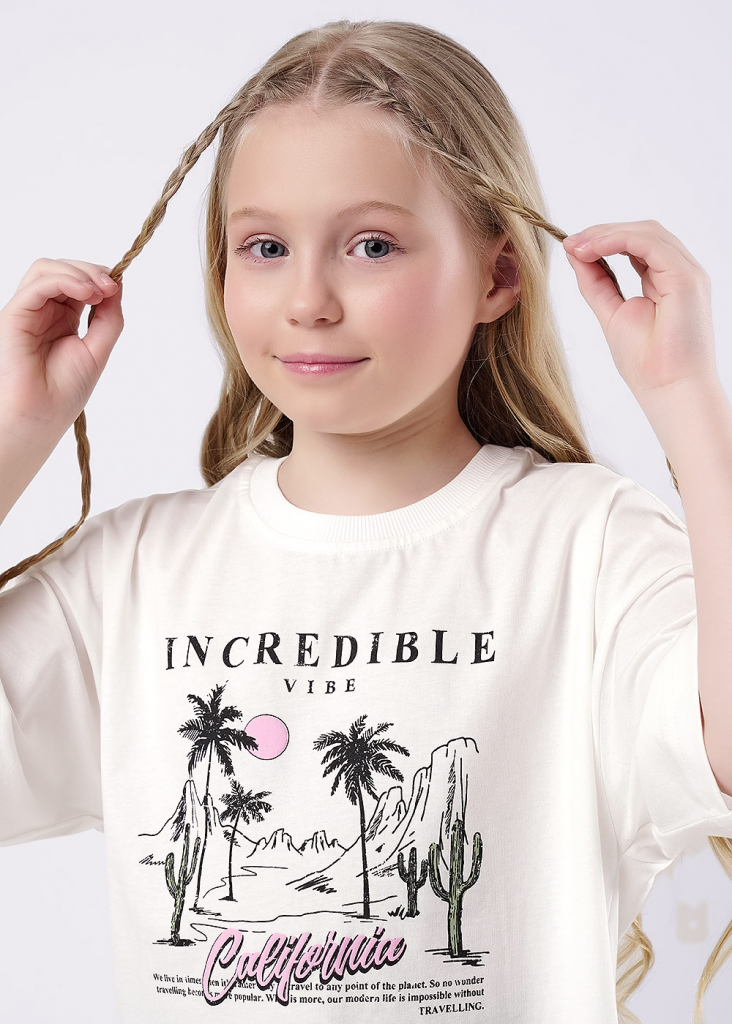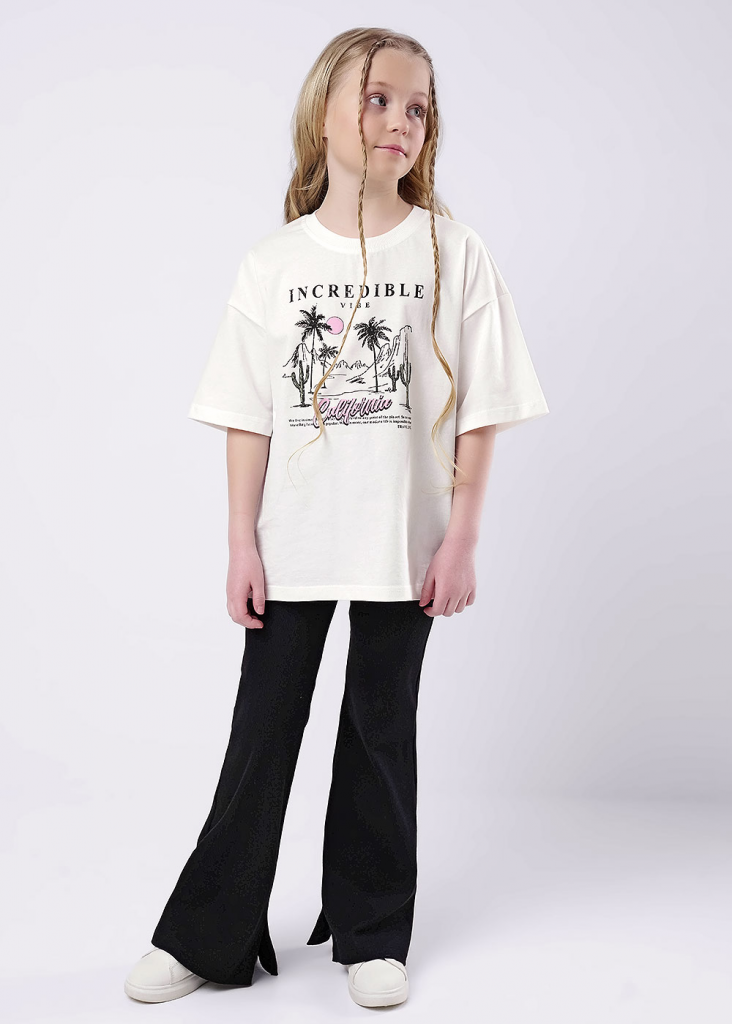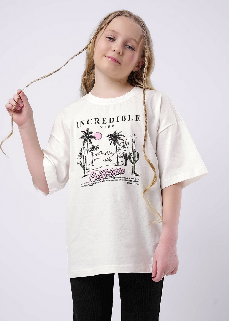 Оверсайз футболка для подростка из 100% хлопка. Горловина оформлена эластичной обтачкой из кашкорсе. Спереди актуальный принт.
