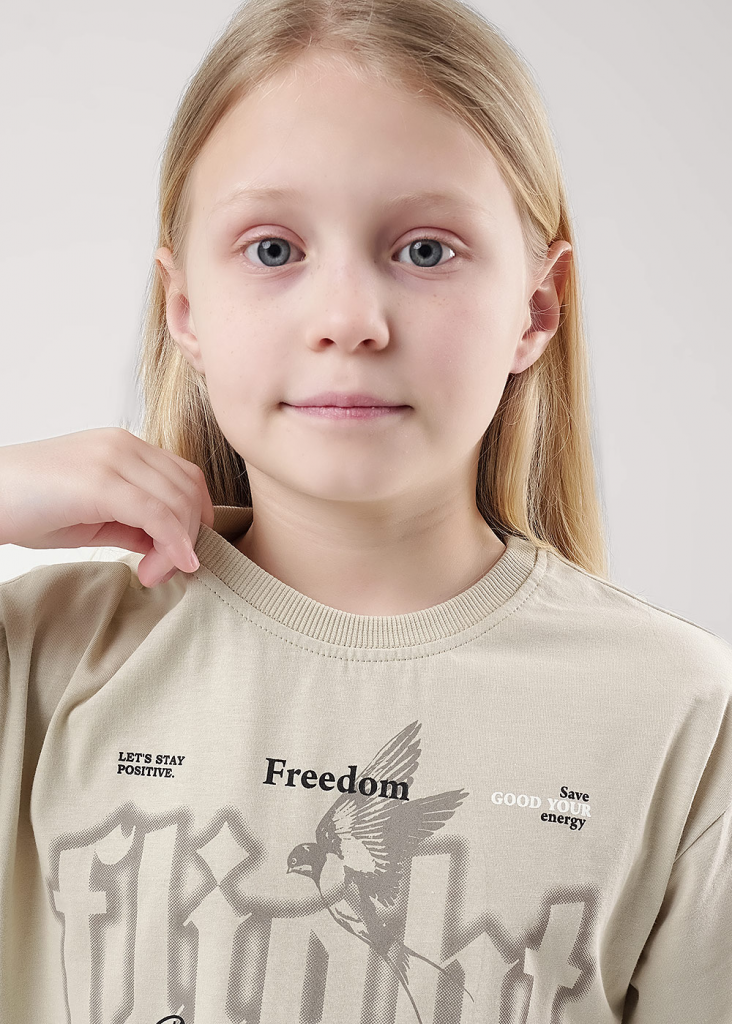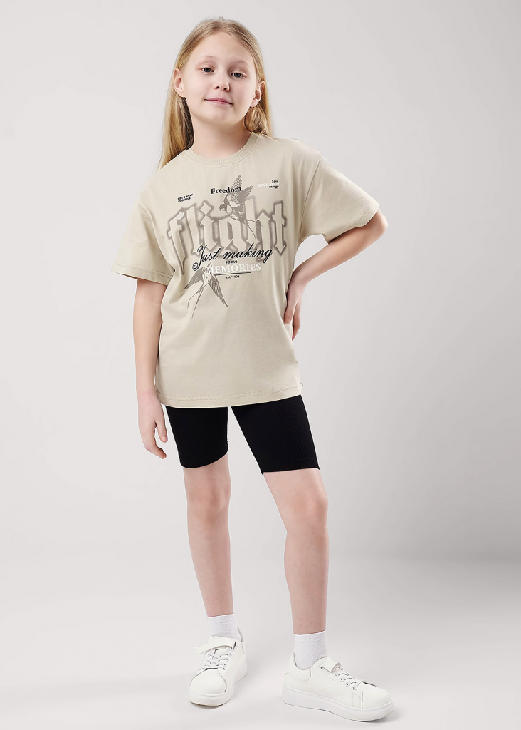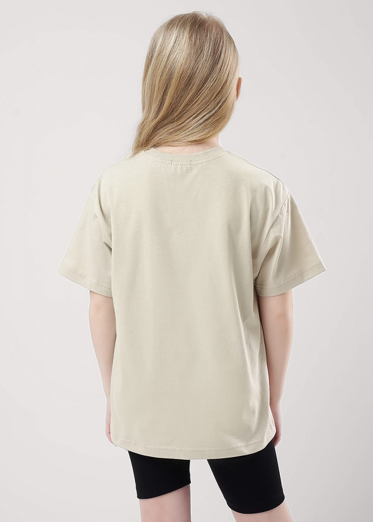 Актуальная футболка умеренного обьема из 100% хлопка отлично впишется в твой летний гардероб. Горловина оформлена кашкорсе. По центру переда трендовый принт.