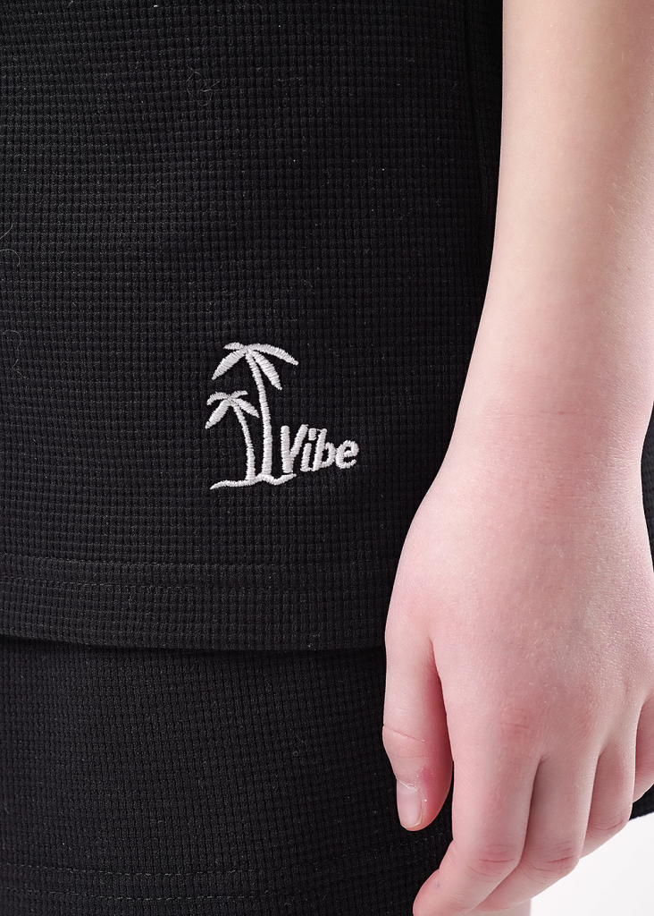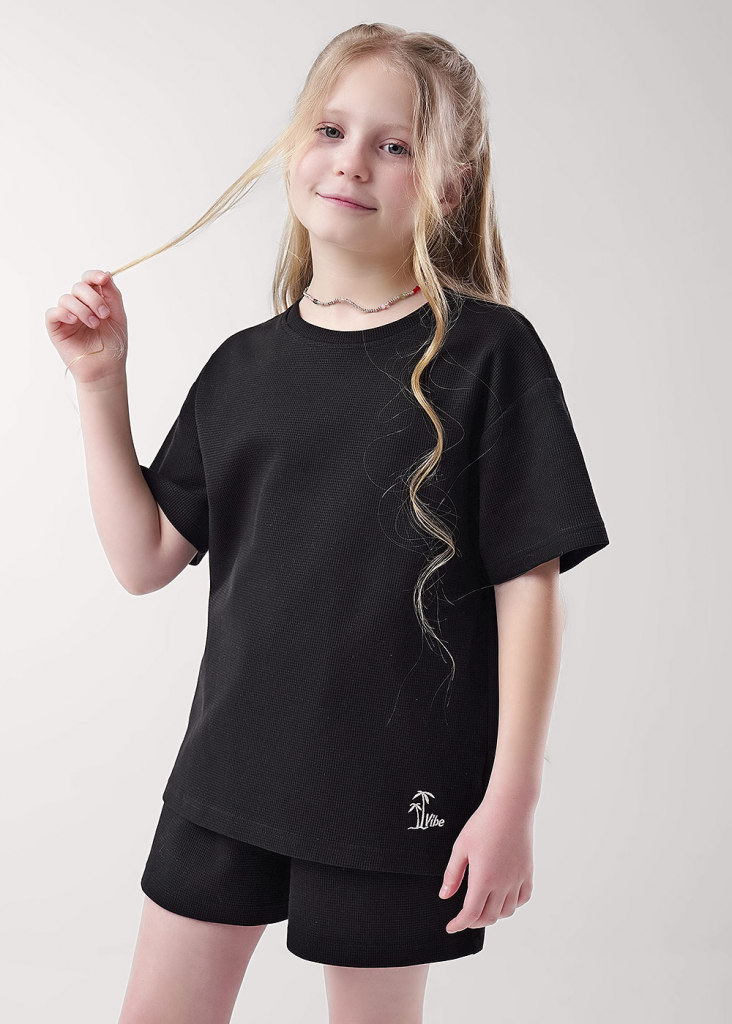 футболка среднего обьема из трикотажного "вафельного" полотна. Горловина оформлена эластичной обтачкой из основы. Спереди вышивка в летней тематике.