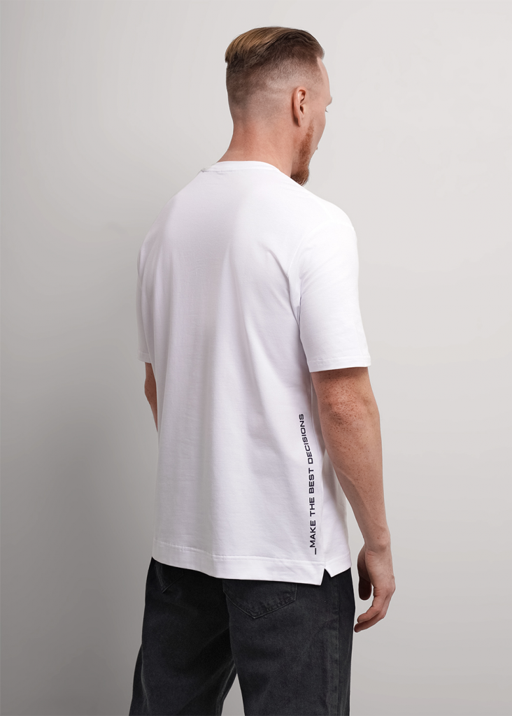 Футболка из трикотажного полотна. С коротким рукавом, круглой горловиной, боковыми разрезами и удлиненной спинкой. Дополнена имиджевым принтом. Отличный вариант для встреч с друзьями и прогулок.