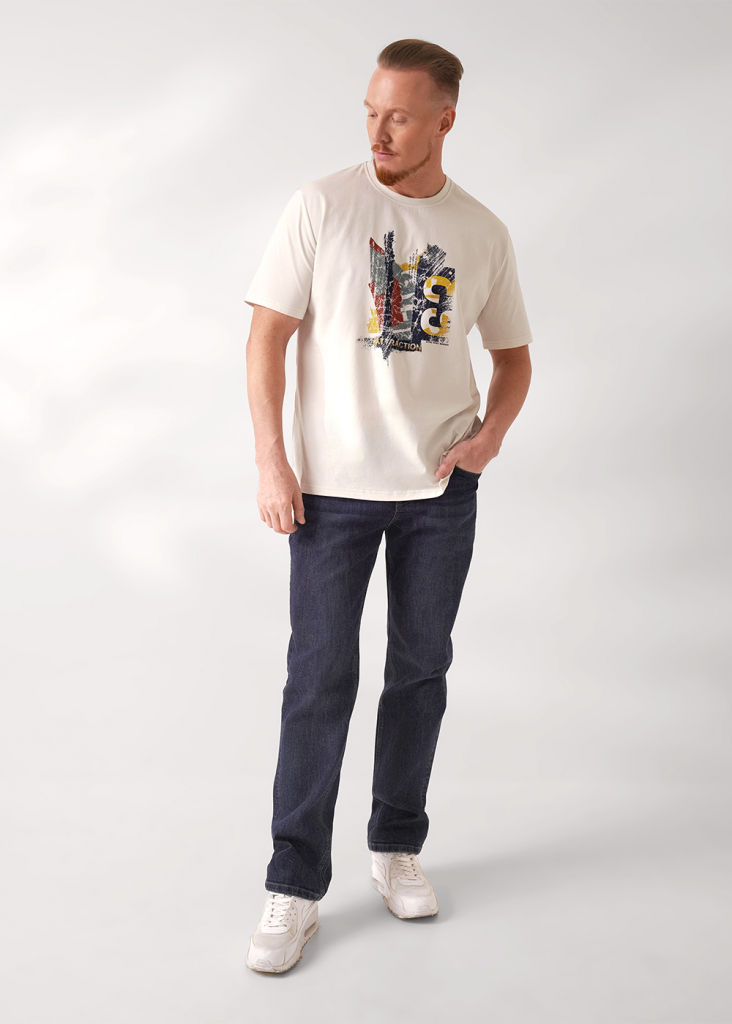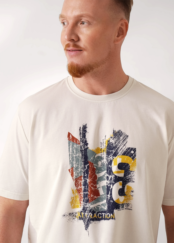 Футболка увеличенного объёма с круглой горловиной из хлопкового полотна. Изделие дополнено имиджевым принтом. Данная модель прекрасно впишется в любой гардероб и составит образ с брюками или джинсами.