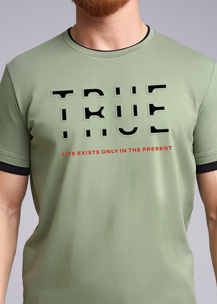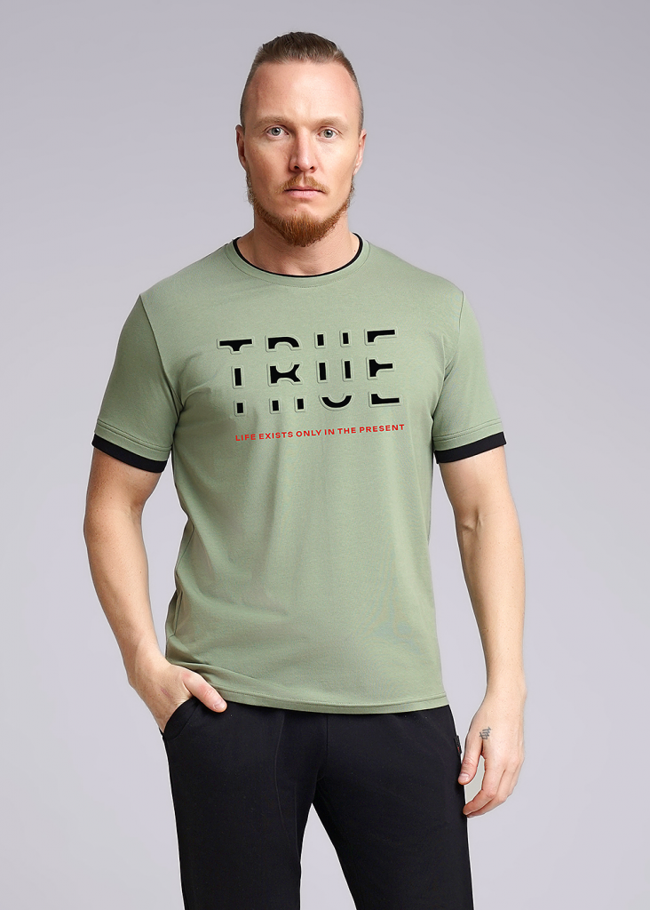 Футболка из трикотажного полотна с круглой горловиной и коротким рукавом. По горловине и низу рукавов конрастные отделки. Дополнена объемным принтом. Отличный вариант для встреч с друзьями и поргулок .