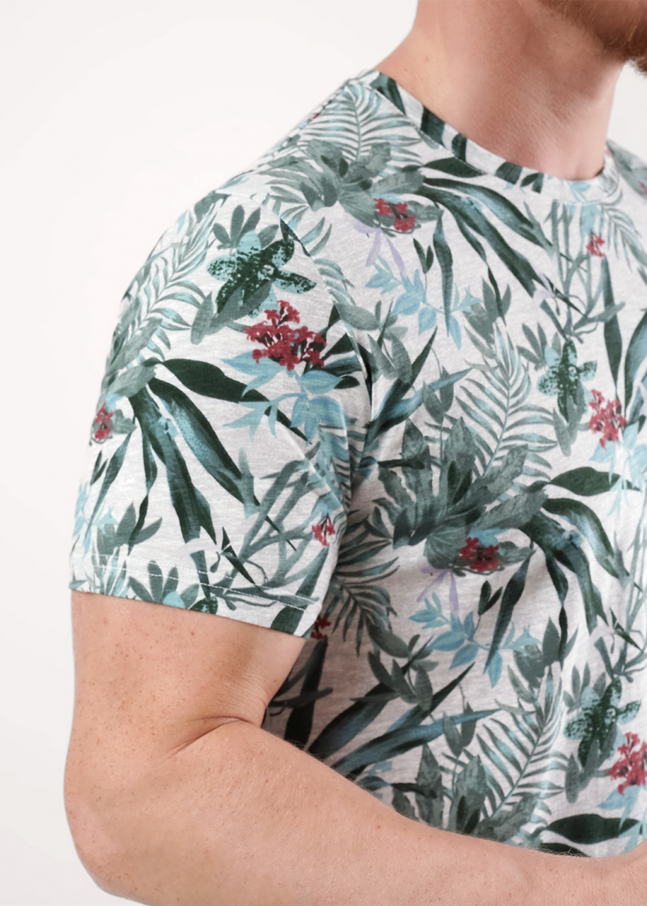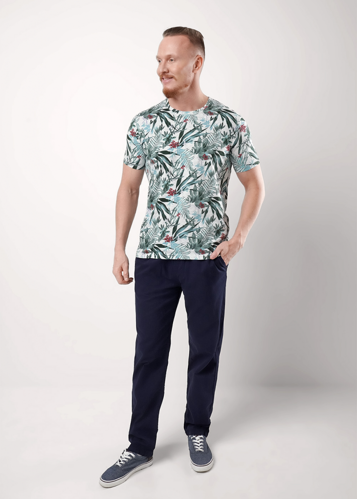 Футболка мужская с круглым вырезом горловины и коротким втачным рукавом из фактурного полотна "флам" с растительной набивкой. Футболку дополняет имиджевая фурнитура. Подойдет для прогулок с друзьями.