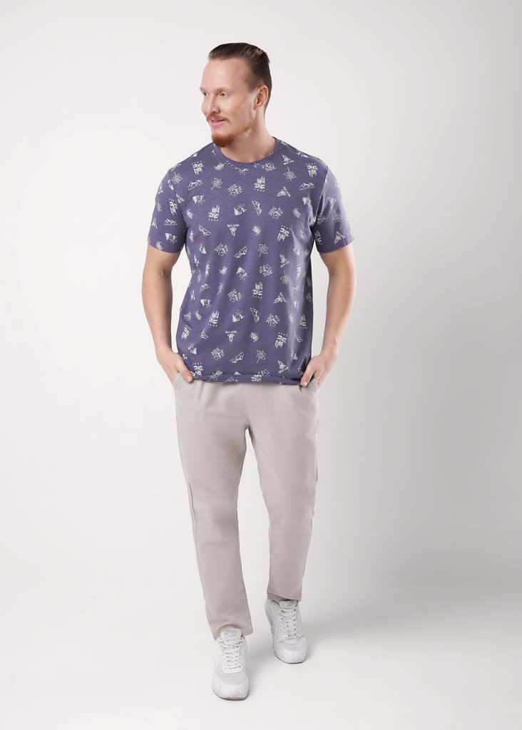 Футболка из дышащего хлопкового фактурного полотна "флам" с округлой горловиной. Модель с абстрактно-шрифтовой набивкой. Прекрасно впишется в гардероб и подойдёт к любому низу. В данной футболке можно отправиться на работу или прогулку с друзьями.