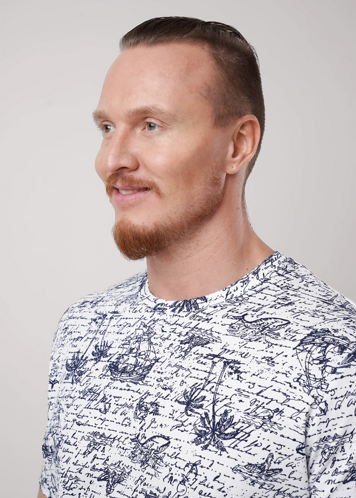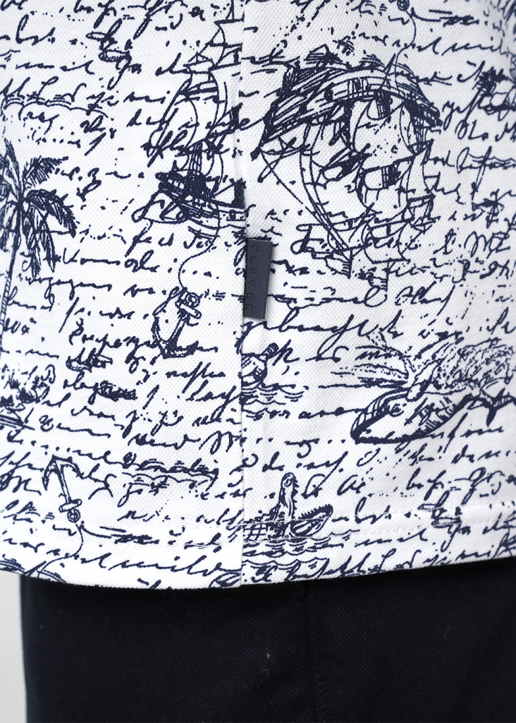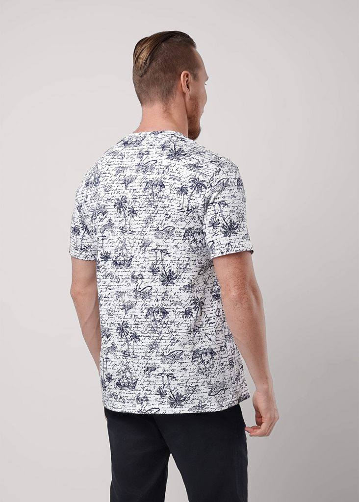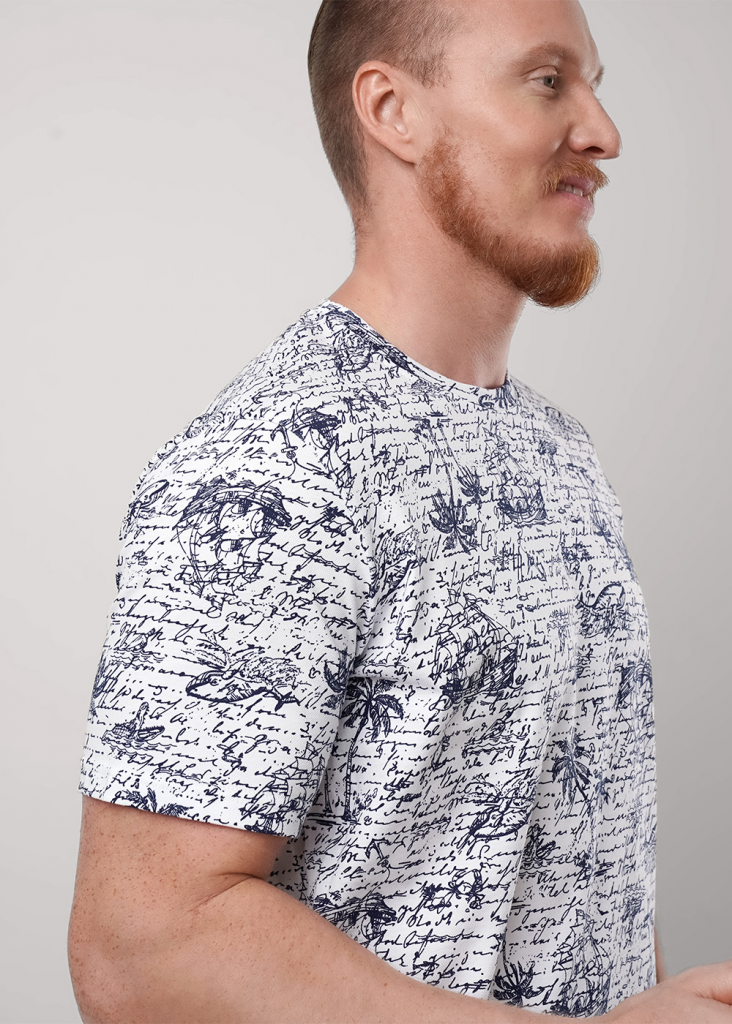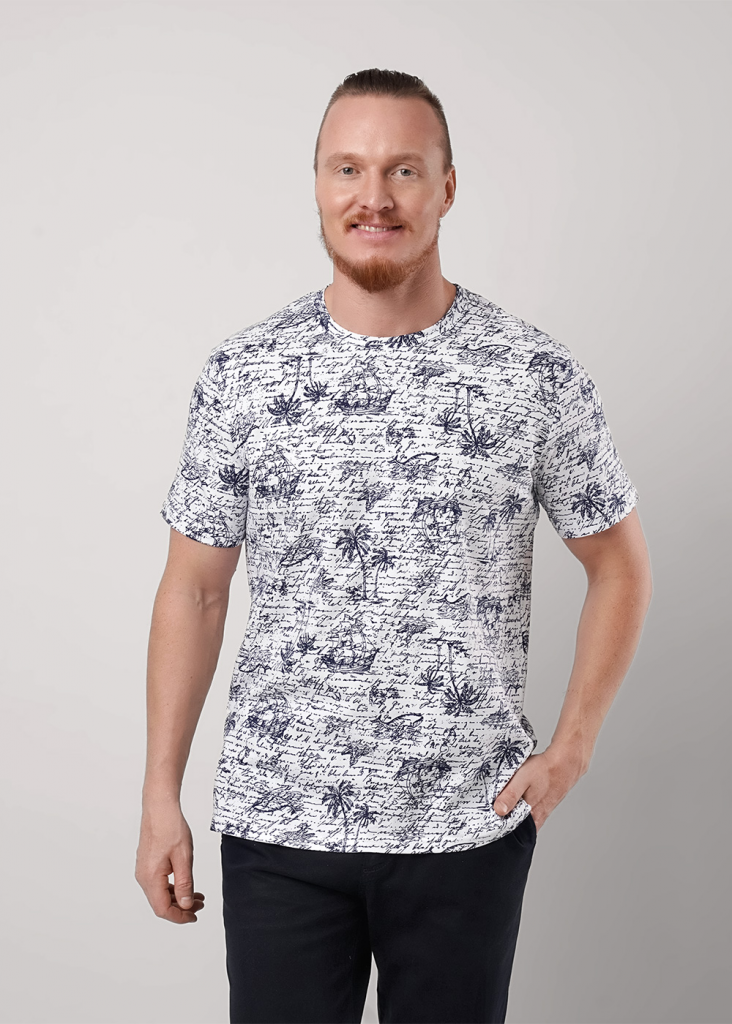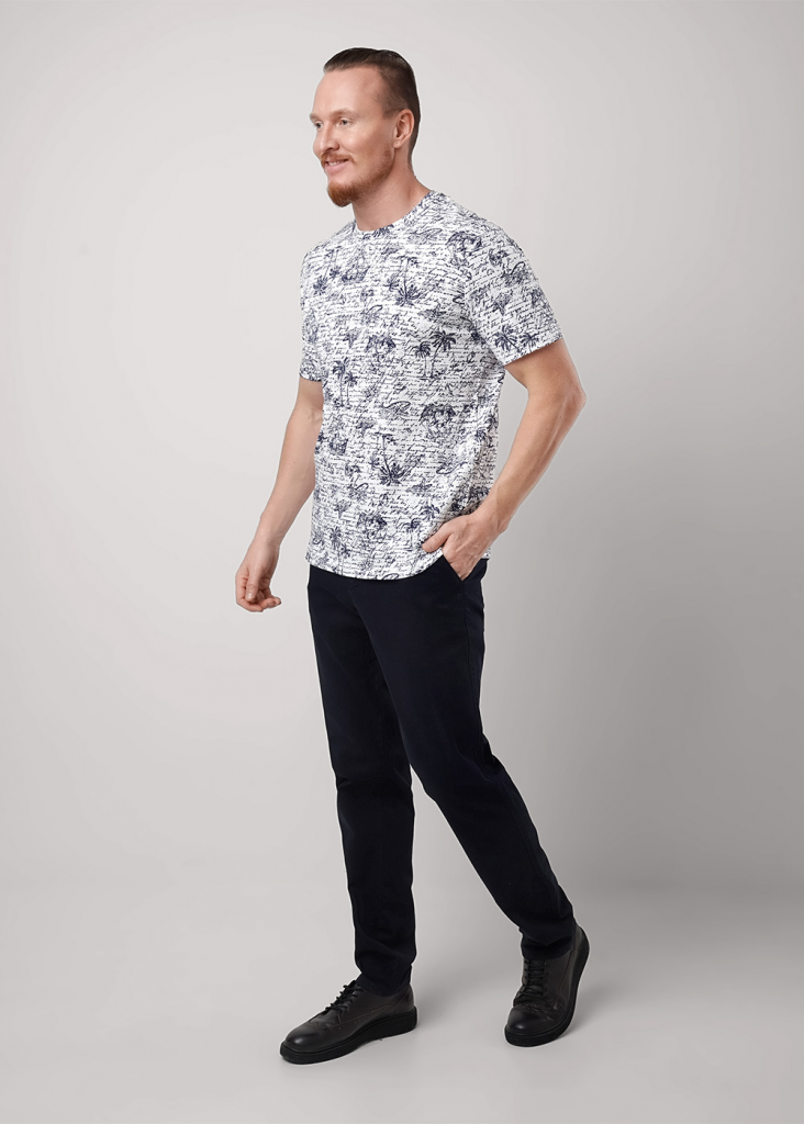 Мужская футболка из дышащего полотна "Пике" с большим содержанием хлопка. С круглой горловиной и коротким рукавом. Модель дополняет дизайнерский принт и имиджевая фурнитура. Отличный вариант для повседневного образа с джинсами.