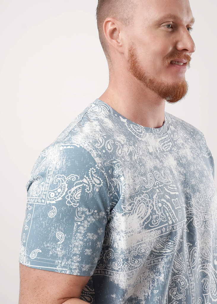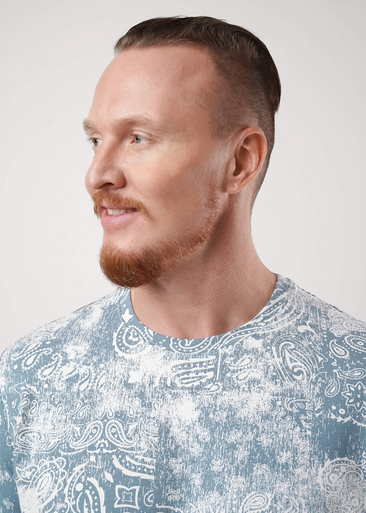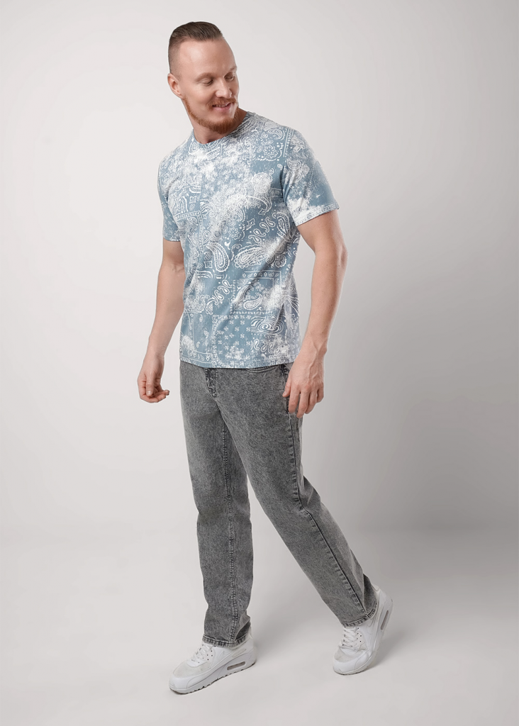 Мужская футболка из трикотажного полотна с абстрактной набивкой, прекрасное решение для похода на работу или прогулки с друзьями. Данная модель отлично впишется в любой гардероб и составит комплект с брюками или джинсами.