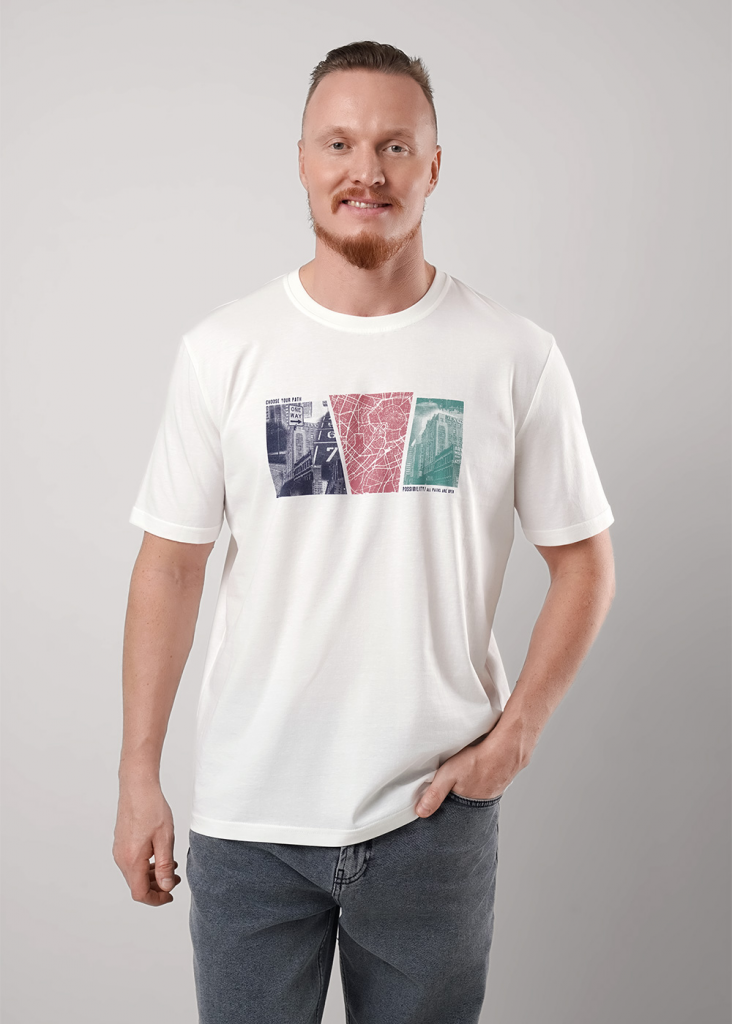 Футболка свободного кроя с круглым вырезом горловины и коротким рукавом. Модель выполнена из трикотажного хлопкового полотна. Изделие дополнено графичным принтом. Универсальная вещь мужского гардероба на каждый день.